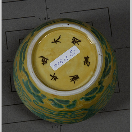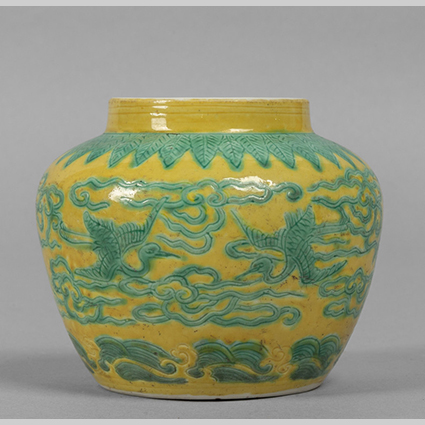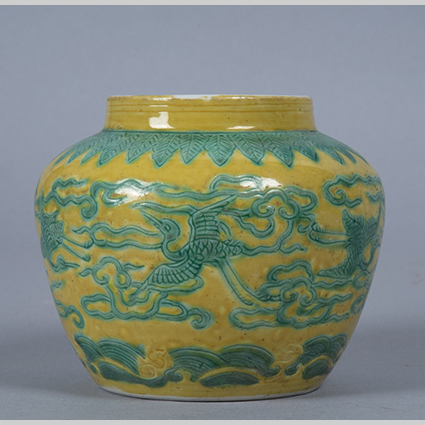 Vaso giallo con sottorilievo verde a motivi di drago marcato dinastia Ming (1368-1644)