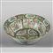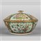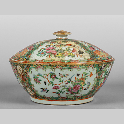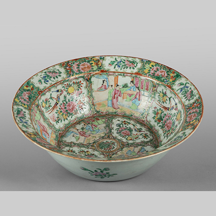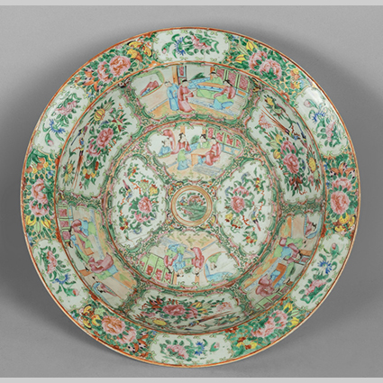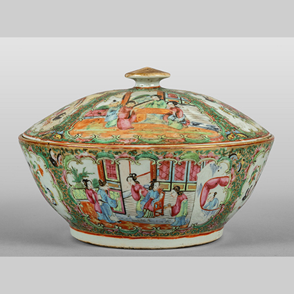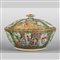 Grande bacile (cm.46xh.14) e ciotola (diam.cm.25) con coperchio in porcellana policroma a decoro di scene orientali Canton sec.XIX
