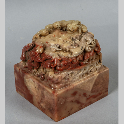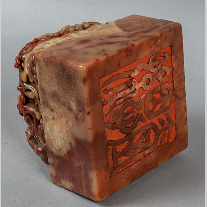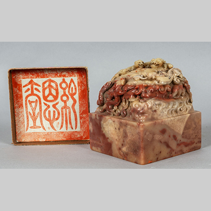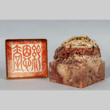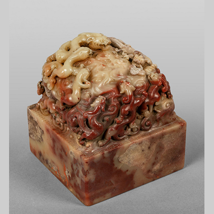 Importante sigillo scolpito in pietra saponaria sormontata da chilong dal corpo ondeggiante base quadrata con incisioni a caratteri arcaici dinastia Qing (1644-1912) Cina sec.XVIII