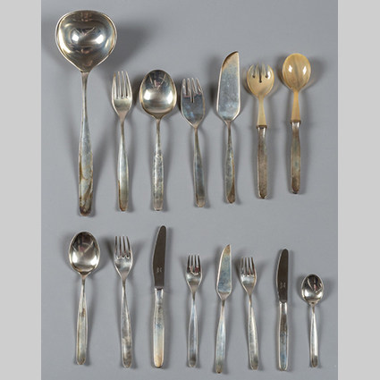 Servizio di posate in argento per 12 composto da : 12 forchette grandi 12 piccole 12 cucchiai grandi e 12 da dolce 12 coltelli grandi e 12 piccoli 12 forchette da pesce con 12 coltelli e 7 posate da portata