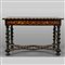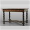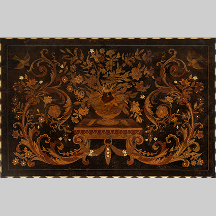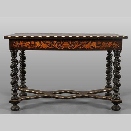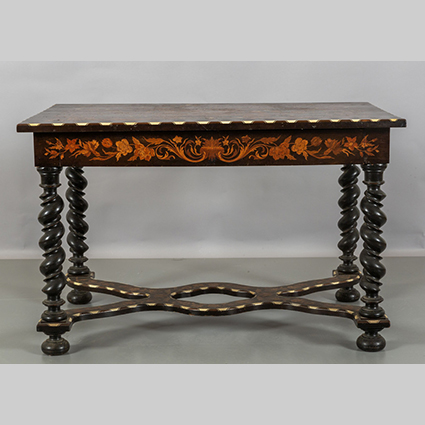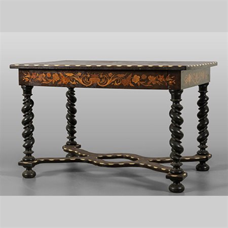 Tavolo in stile Luigi XIII intarsiato sul piano con grande vaso di fiori gambe a tortiglione unite da traverse con intarsi in legni vari ed avorio Francia sec.XIX