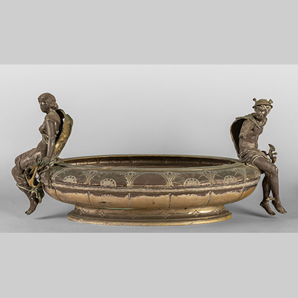Grande centrotavola Liberty in argento con figure mitologiche ai lati (manto delle due figure in bronzo)
