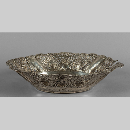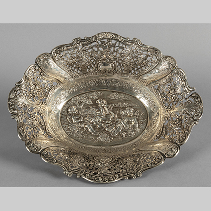 Centrotavola a cestino in argento sbalzato con fiori ed angioletti sec.XX