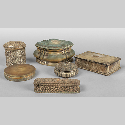 Previous Lot 1083 Next Aste Boetto - Via Mura dello Zerbino 10R, 16122 Genova ASTA DI ANTIQUARIATO E ARTE ORIENTALE Asta di Antiquariato e Arte Orientale Tuesday 26 September 2023 hours 10:00 (UTC +01:00) OGGETTISTICA Sei scatole diverse di cui 4 in argento (gr.950)