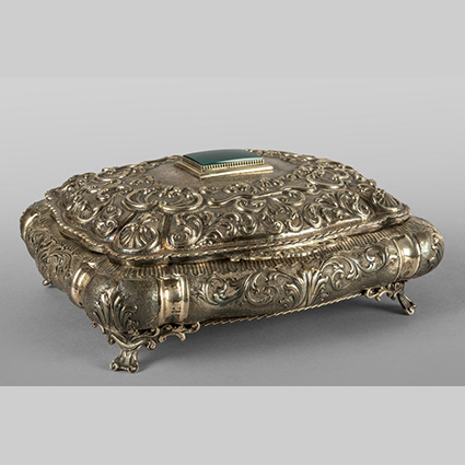Scatola portagioie in argento sbalzato con pietre dure nel coperchio