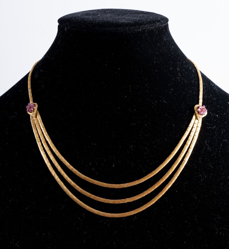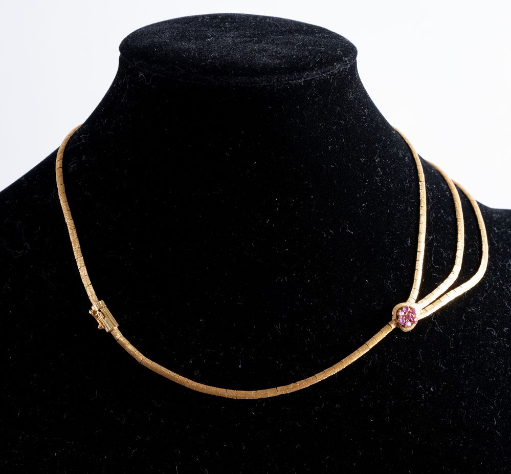 COLLANA IN ORO E RUBINI Collana in oro giallo 18K, realizzata con segmenti...