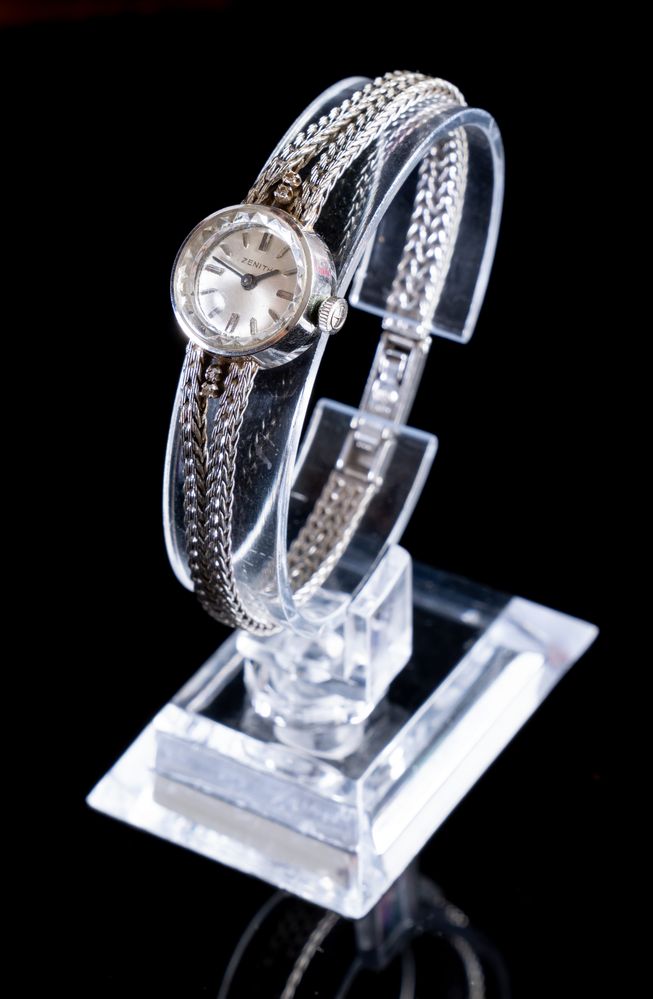 Orologio per signora in oro bianco 18K. Cassa in oro bianco 18Kt, fondello a pressione, lunetta liscia, quadrante argenté marcato Zenith, indici a bastone, movimento a carica manuale, bracciale in oro bianco a due file di maglie, vetro plastica, diametro 17 mm.