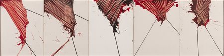 SCANAVINO EMILIO (1922 - 1986) Senza titolo (Polittico). 1970. Acrilico e matita grassa su carta. Cm 85,00 x 22,00. Opera realizzata su n° 5 cartoncini di dimensioni 22x17 cm ciascuno. Opera archiviata presso Associazione Amici dell'Archivio Emilio Scanavino, Milano, come da documentazione fotografica allegata all'opera riportante il relativo numero d'inventario. Cornice presente