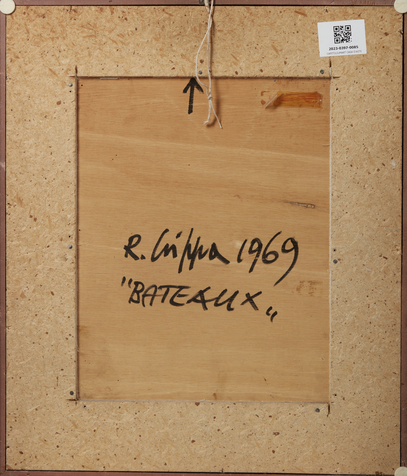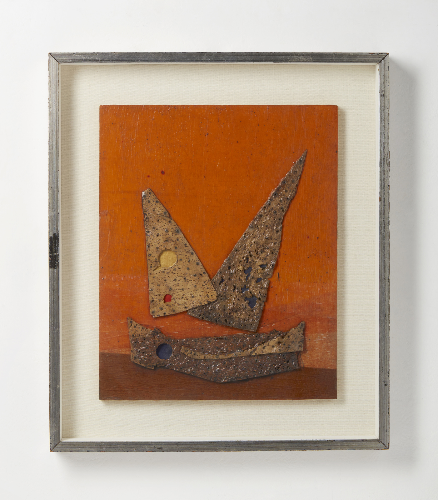 CRIPPA ROBERTO GAETANO (1921 - 1972) Bateaux. 1969. Olio, collage e sughero su tavola. Cm 33,00 x 41,00. Al retro titolo, firma e anno. Autentica su fotografia di Roberto Crippa Jr riportante il relativo numero d'inventario. Provenienza: Collezione Besner - Decca, Piacenza. Difetti. Cornice presente