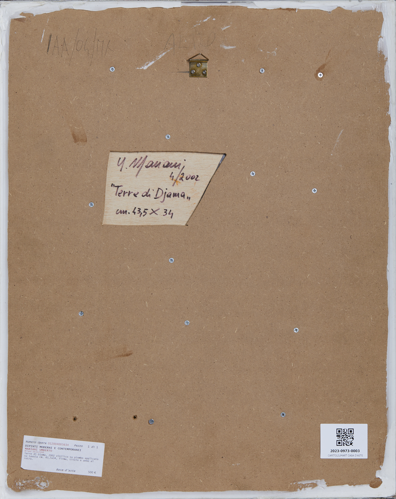 MARIANI UMBERTO (n. 1936) Terre di Djana. . 2002. Tecnica mista su piombo. Cm 34,00 x 43,50. Al retro firma, titolo e anno. Autentica dell'artista su fotografia. Provenienza: Collezione privata, Como. Lievi difetti. Cornice presente