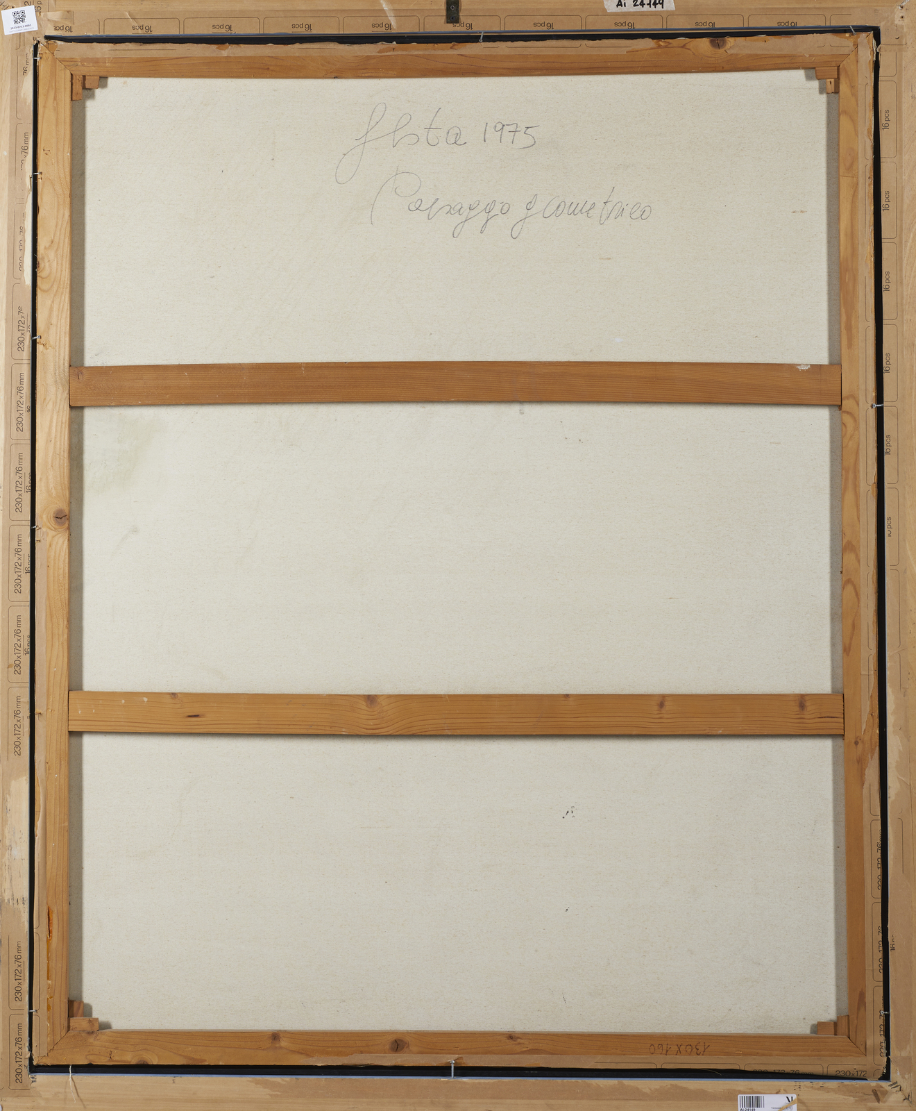FESTA TANO (1938 - 1988) Paesaggio geometrico. 1975. Smalto e acrilico su tela. Cm 130,00 x 160,00. Al retro titolo, firma e anno. Opera archiviata presso lo Studio Soligo, Roma, come da documentazione fotografica allegata all'opera riportante il relativo numero d'inventario. . Cornice presente