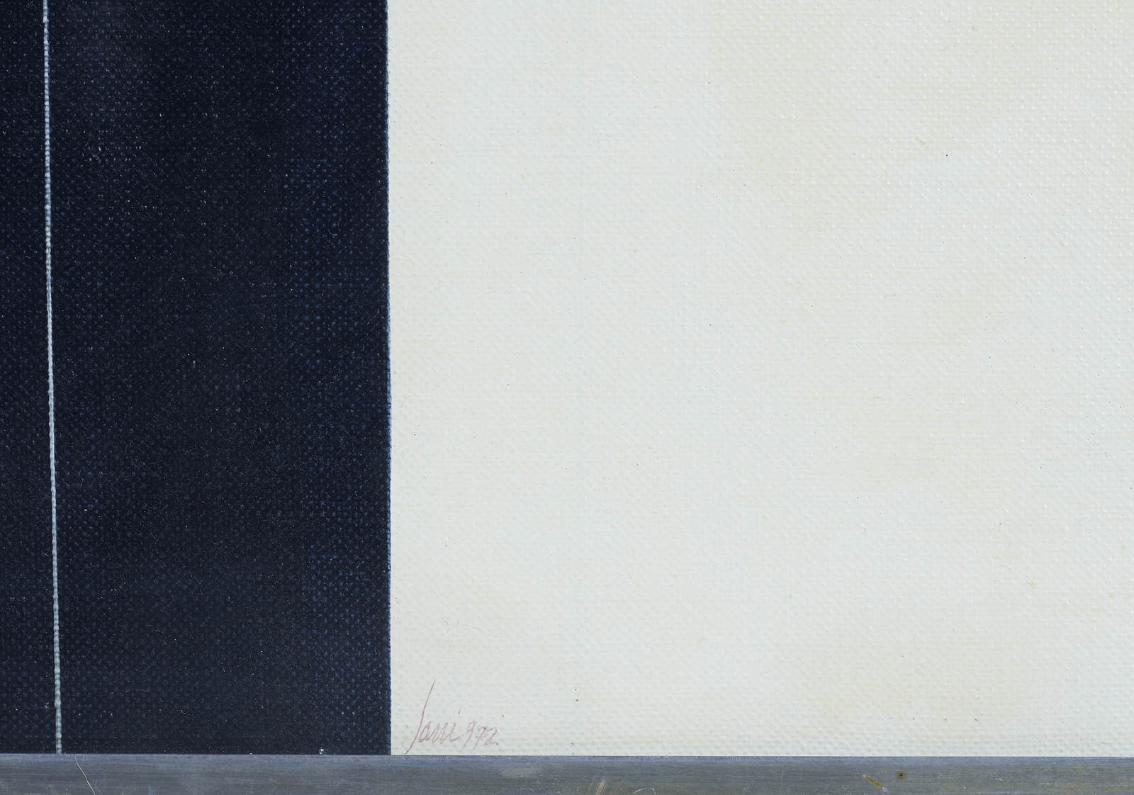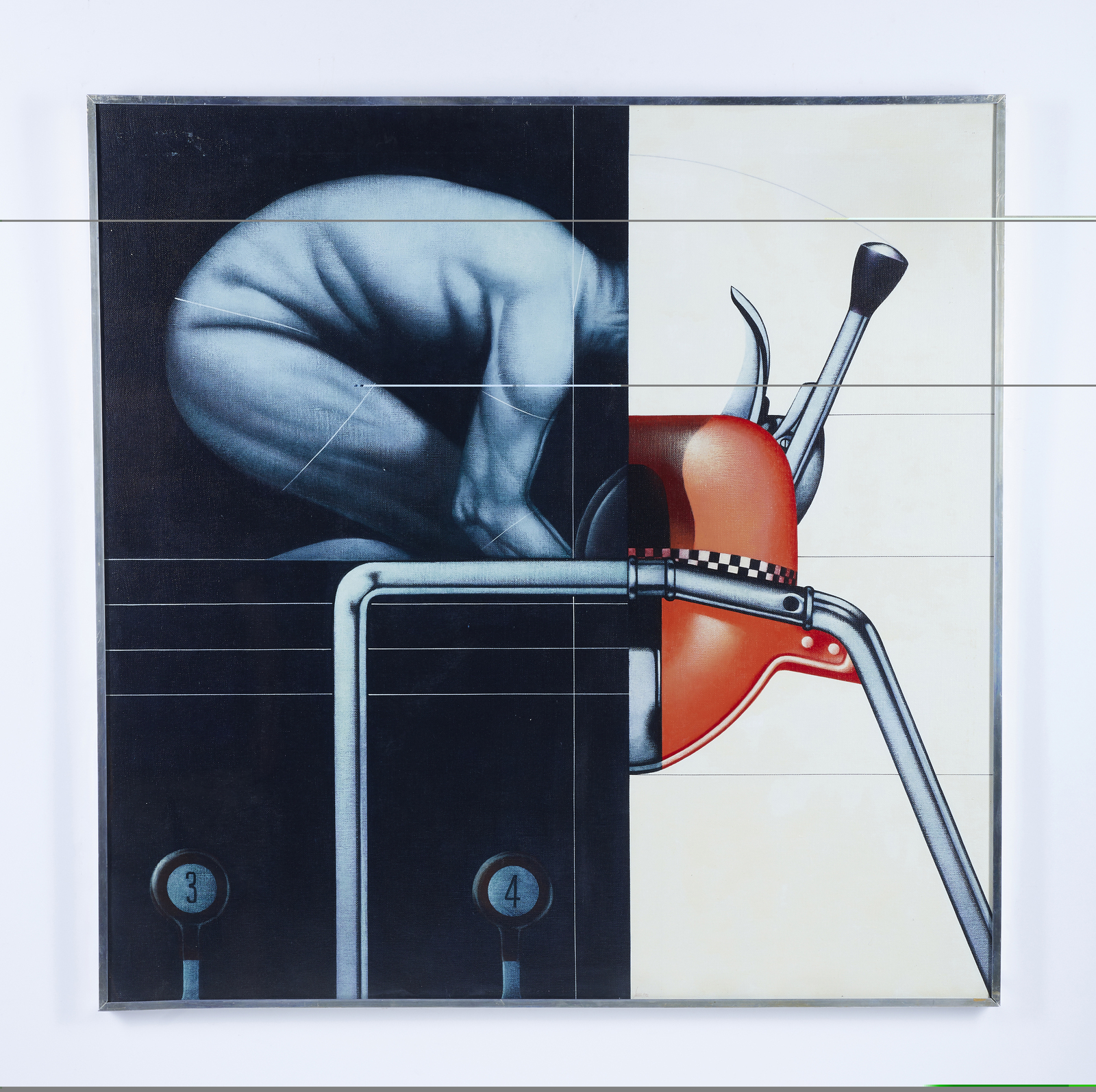 SARRI SERGIO (n. 1938) Esercizio all'attrezzo. 1972. Olio su tela . Cm 100,00 x 100,00. Firma e anno in basso al centro. Al retro titolo, firma e anno. Certificato di provenienza rilasciato da Galleria d'Arte Vinciana, Milano, come da documentazione fotografica allegata all'opera. Provenienza: Galleria d'arte Vinciana, Milano; Collezione privata, Como. Lievi difetti. Cornice presente
