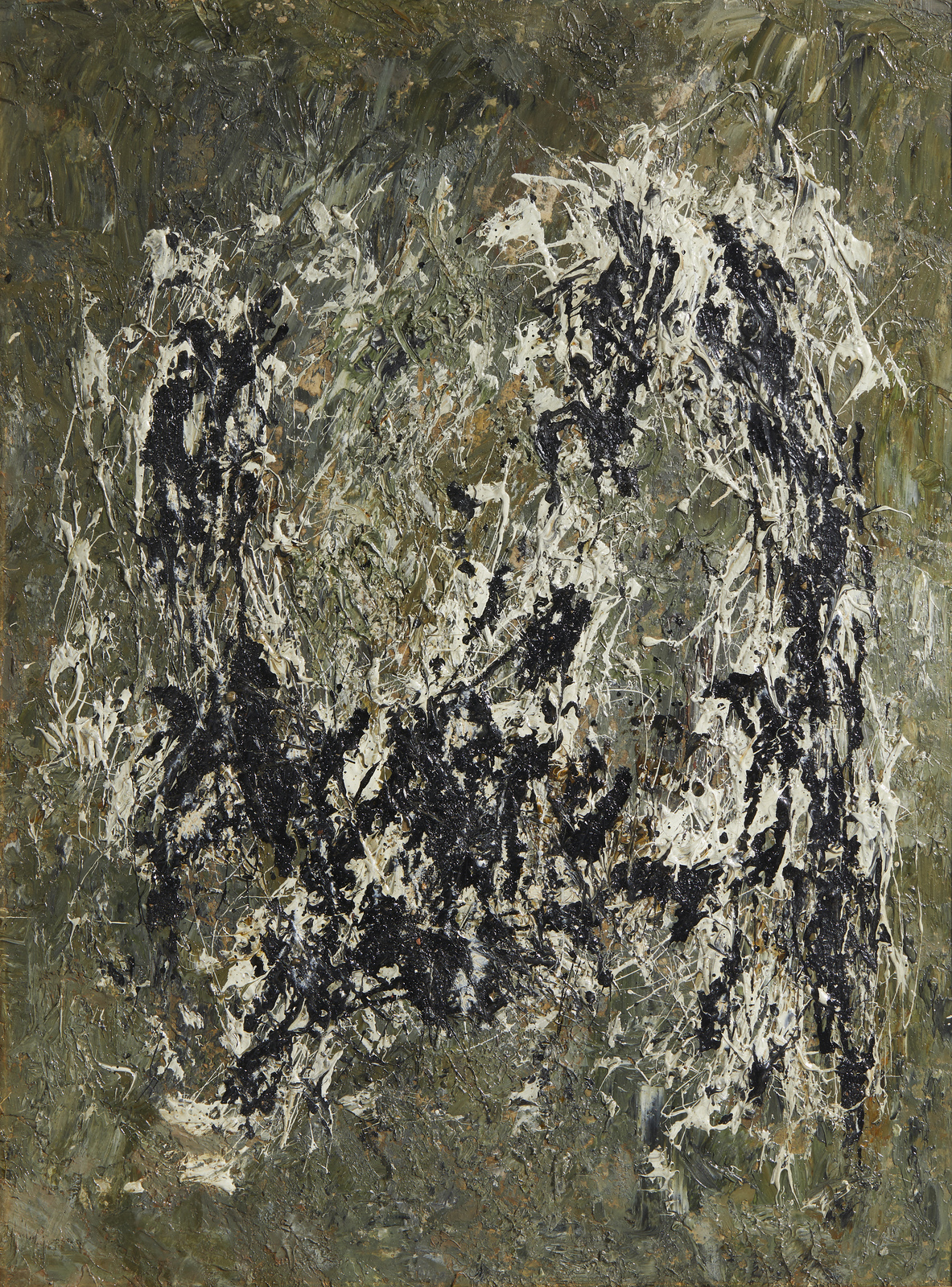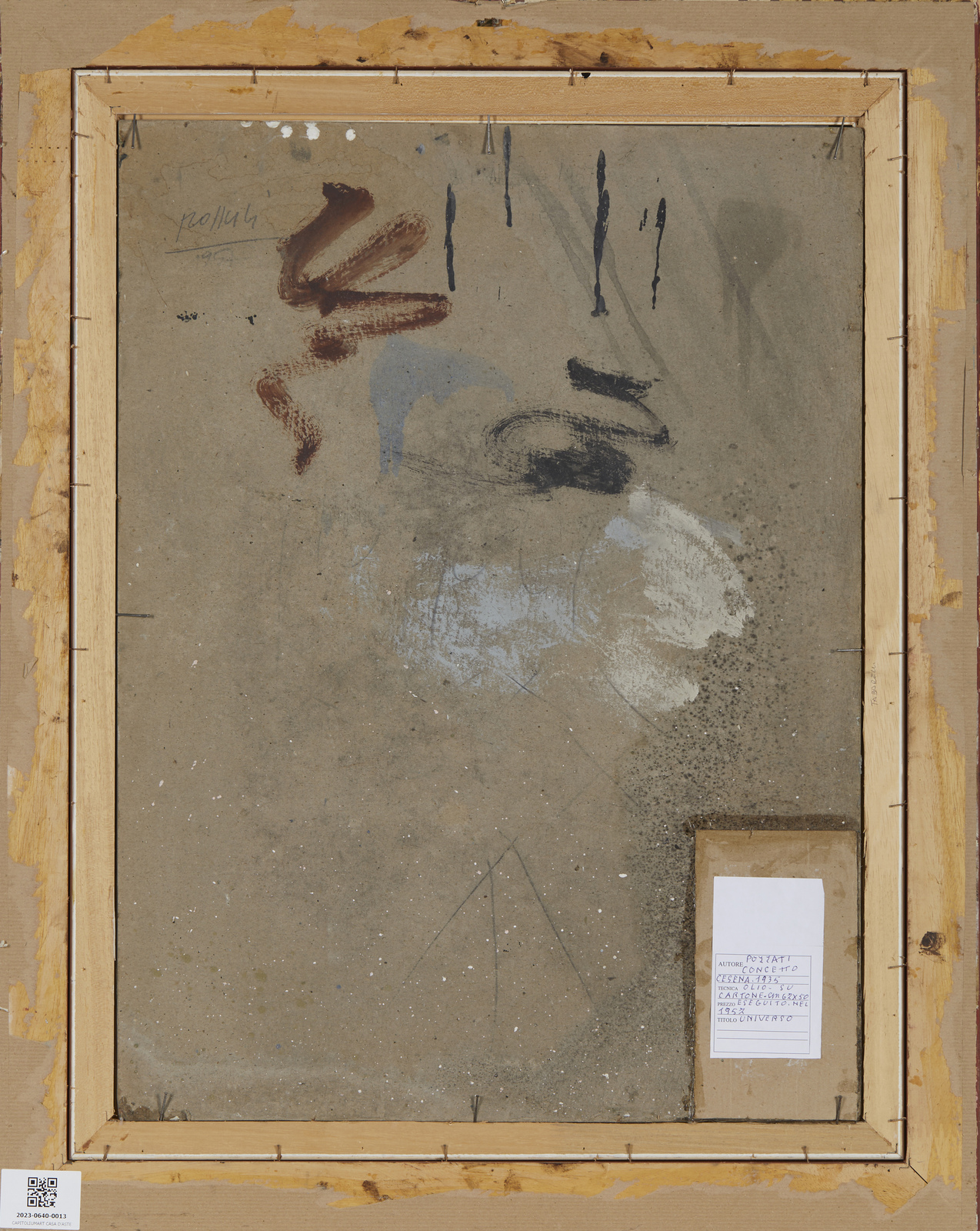 POZZATI CONCETTO (1935 - 2017) Universo. 1957. Olio su cartone. Cm 49,50 x 67,00. Al retro firma, anno e cartiglio descrittivo. Autentica dell'artista su fotografia. Lievi difetti. Cornice presente