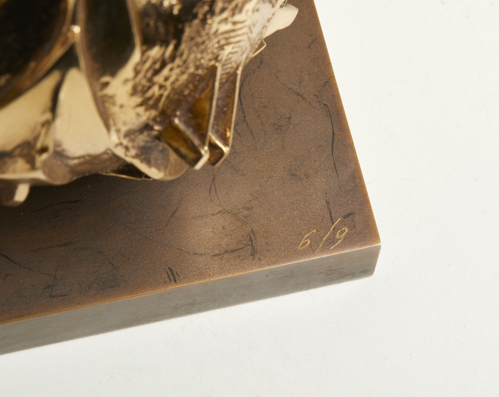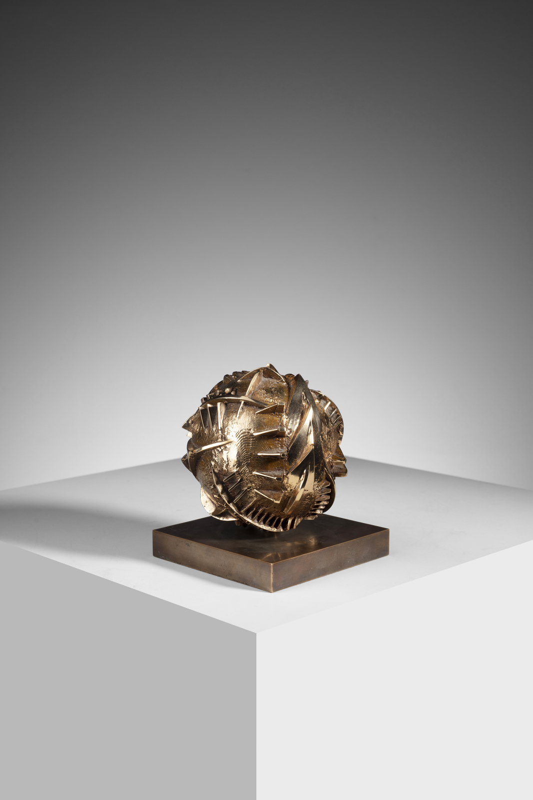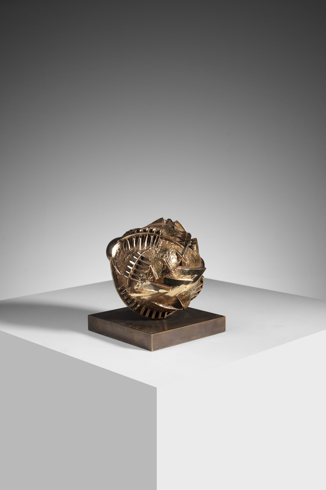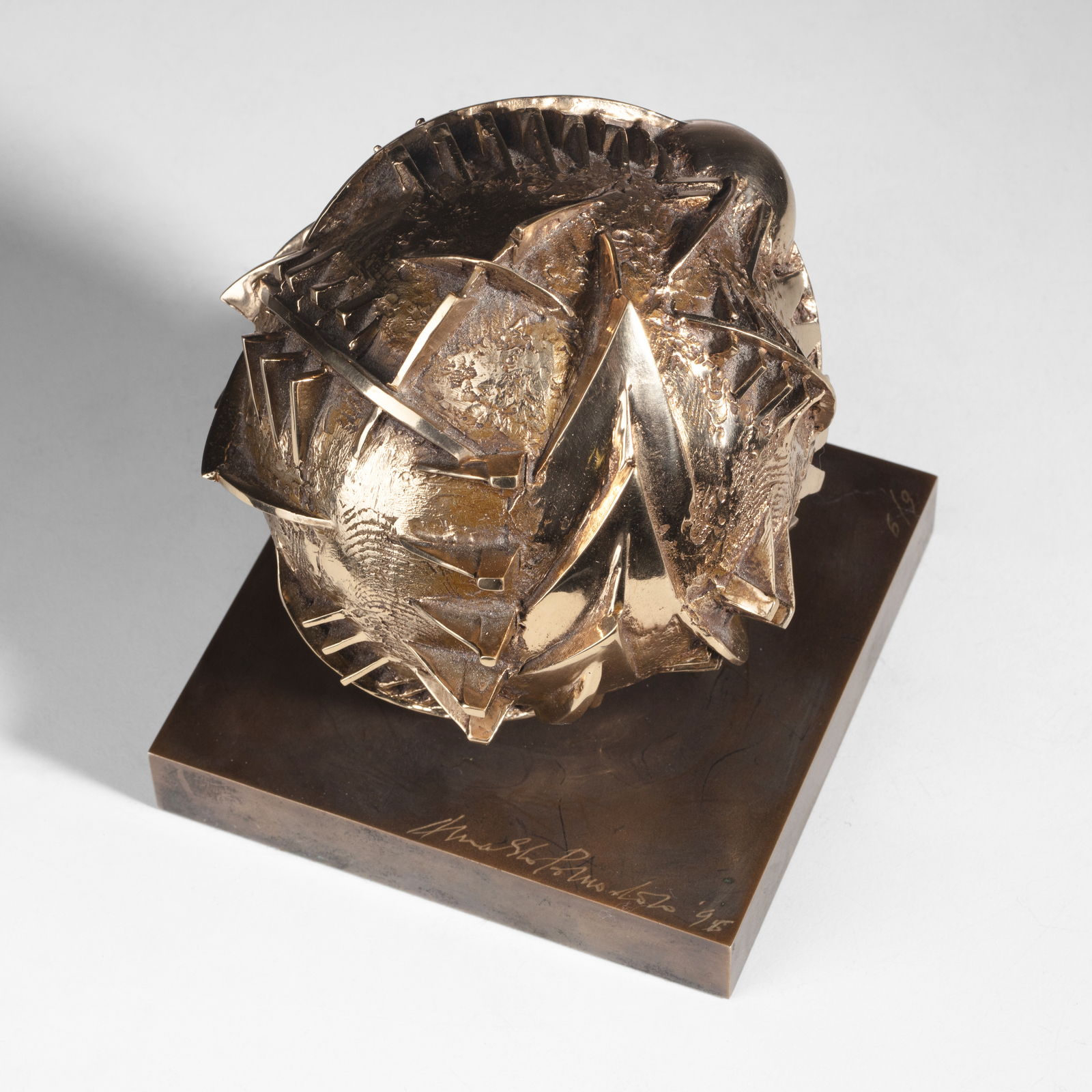 Pubblicazioni: Bonhams 23488, catalogo d'asta, New York, NY, 13 novembre 2019, Post-War & Contemporary Art, n. 30, ill. p. 89 (altro esemplare); Arnaldo Pomodoro. Catalogo ragionato della scultura, a cura di F. Gualdoni, Skira editore, Milano, 2007, ill. p. 730 (cat. 954) (altro esemplare) ; Arnaldo Pomodoro. "Sphere within a Sphere" for the U.N. Headquarters, Il Cigno Galileo Galilei, Roma, 1997, p.98 (altro esemplare). Dimensioni con base: 14x11x11 cm.