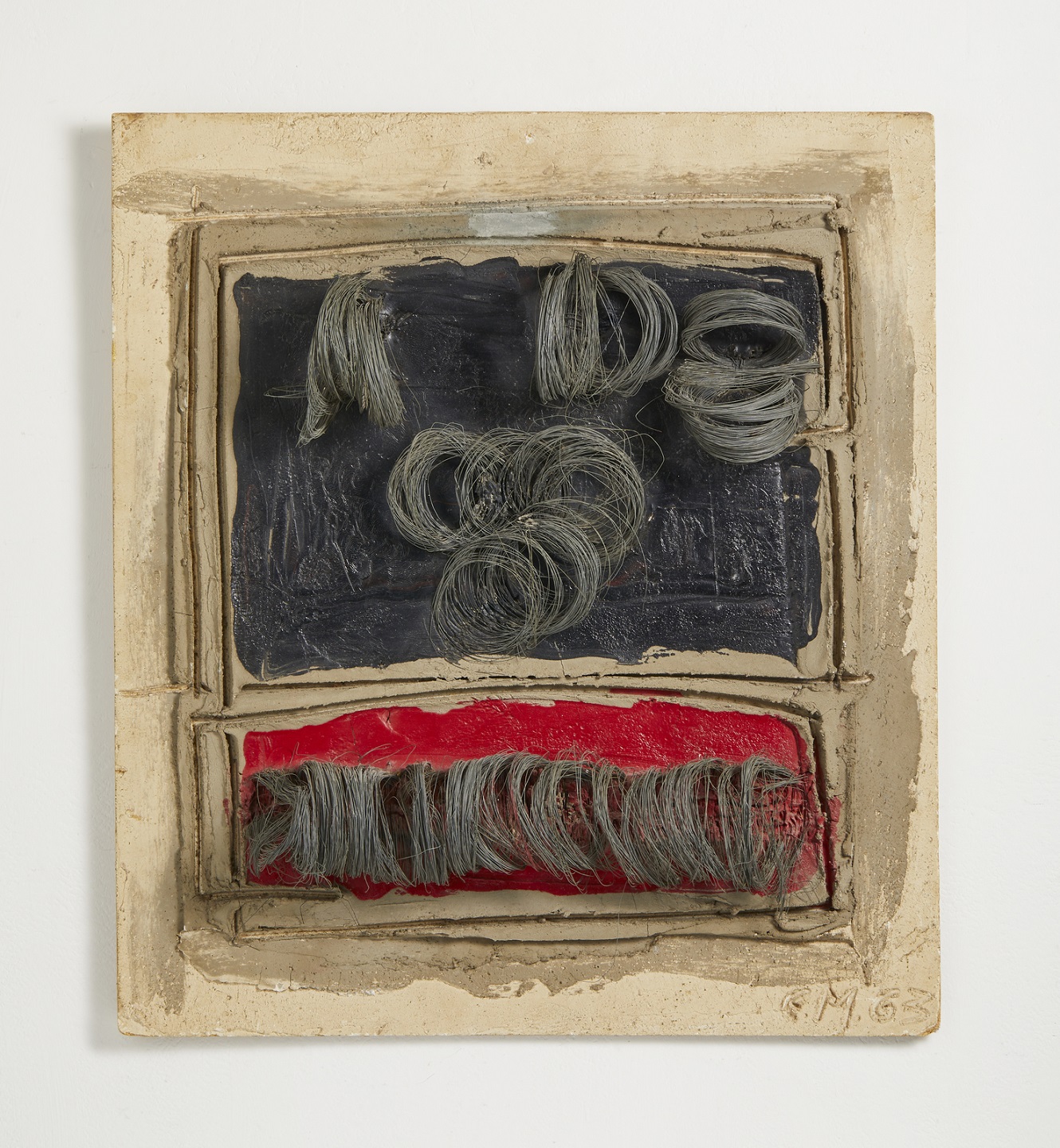 MATTIACCI ELISEO (1940 - 2019) Senza titolo. 1963. Cemento, ferro e acrilici su tavola. Cm 60,00 x 67,00 x 10,00. Monogramma e anno in basso a destra. Presente documentazione fotografica che ritrae l'artista con l'opera. Lievi difetti.