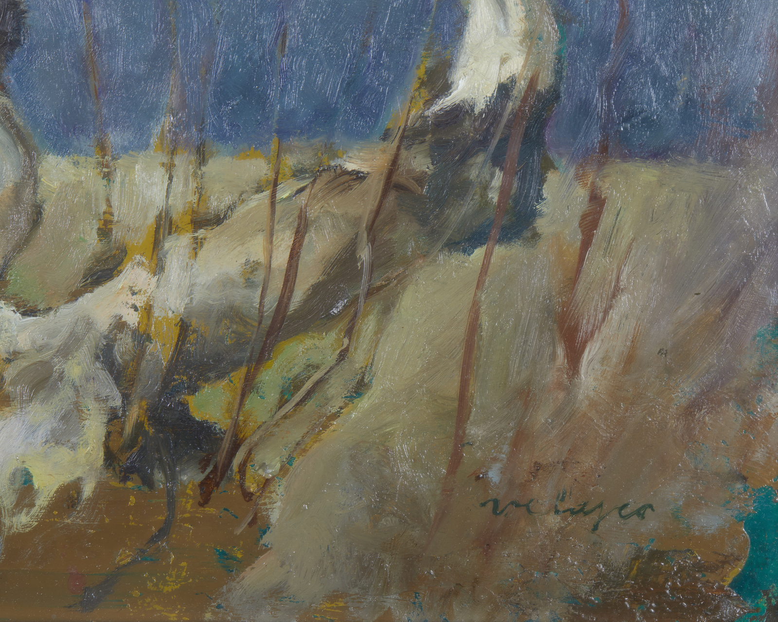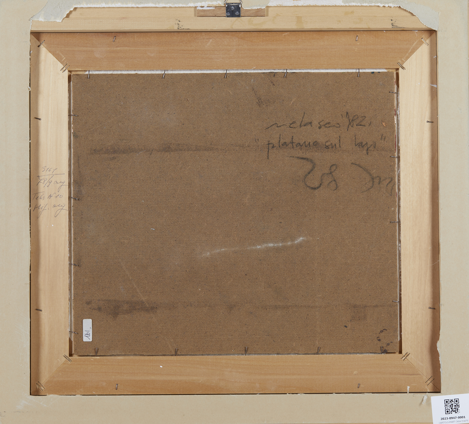 VITALI VELASCO (n. 1960) Platano sul lago. 1982. Olio su masonite. Cm 43,50 x 37,70. Firma in basso a destra. Al retro titolo, firma e anno. Provenienza: Galleria Bellinzona, Lecco; Collezione privata, Forlì. Lievi difetti. Cornice presente