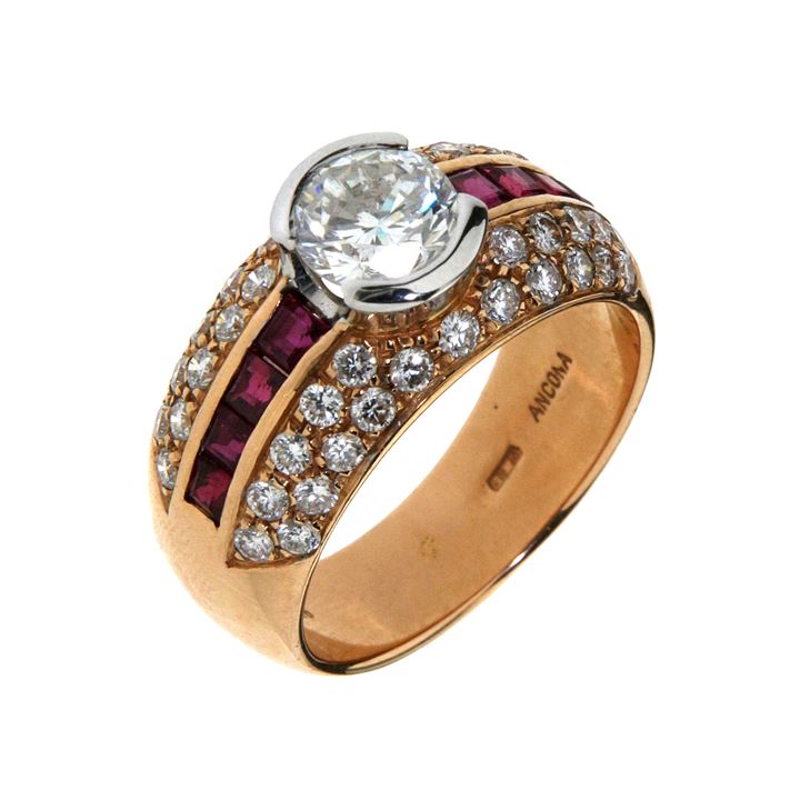 colore H, purezza VVS1; con pavè di diamanti taglio brillante rotondo per complessivi ct 0, 55 ca ed una fila di piccoli rubini taglio carrè