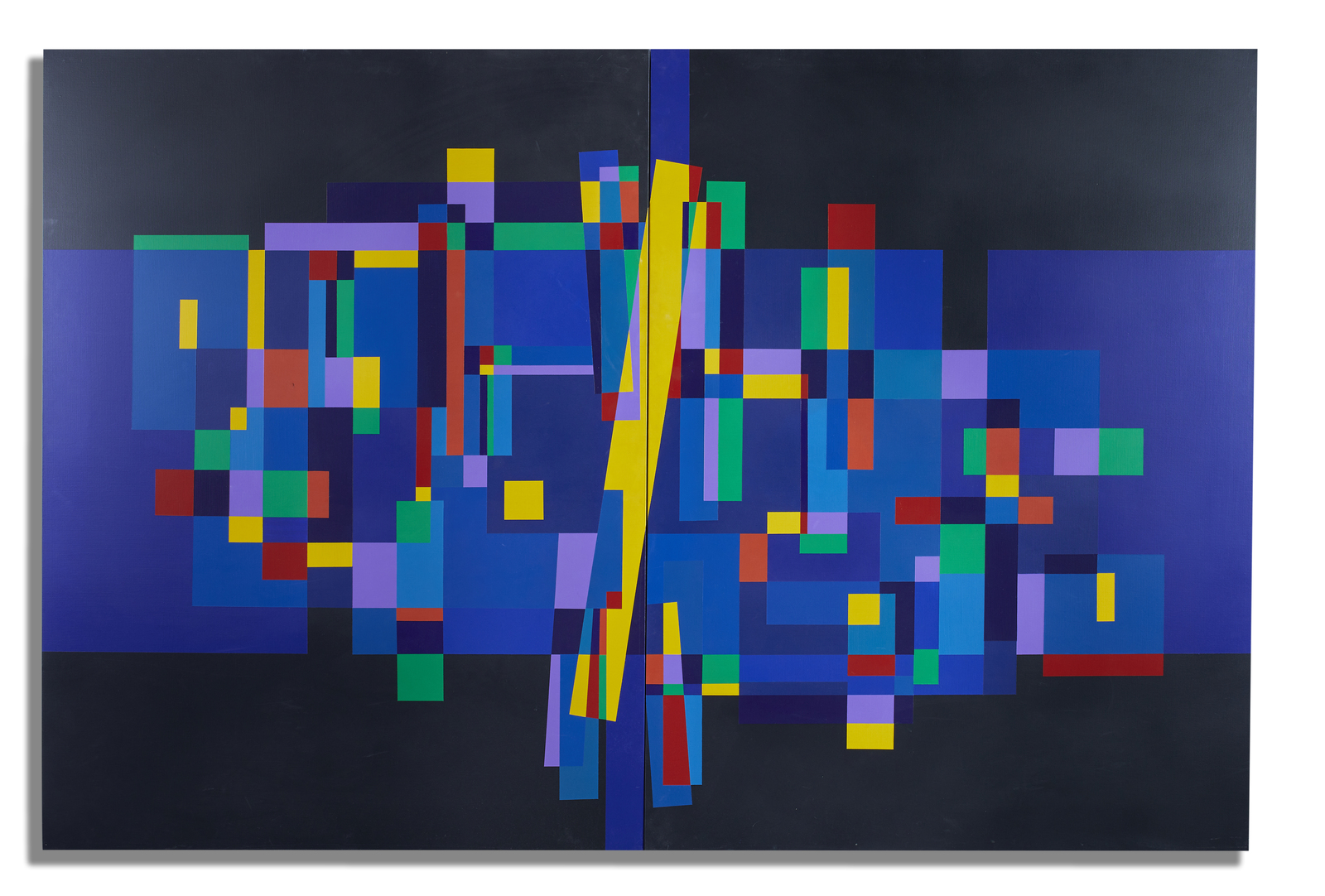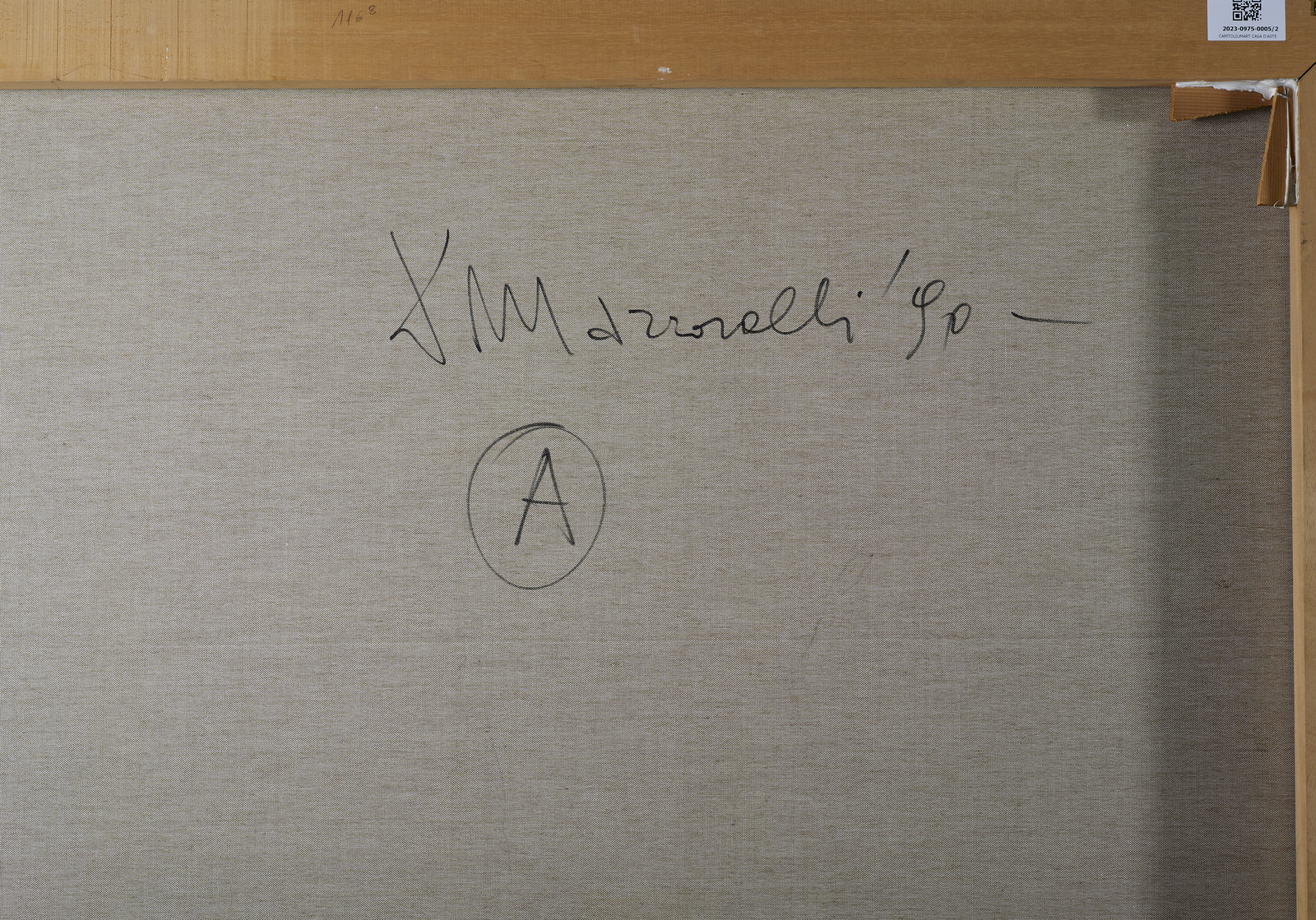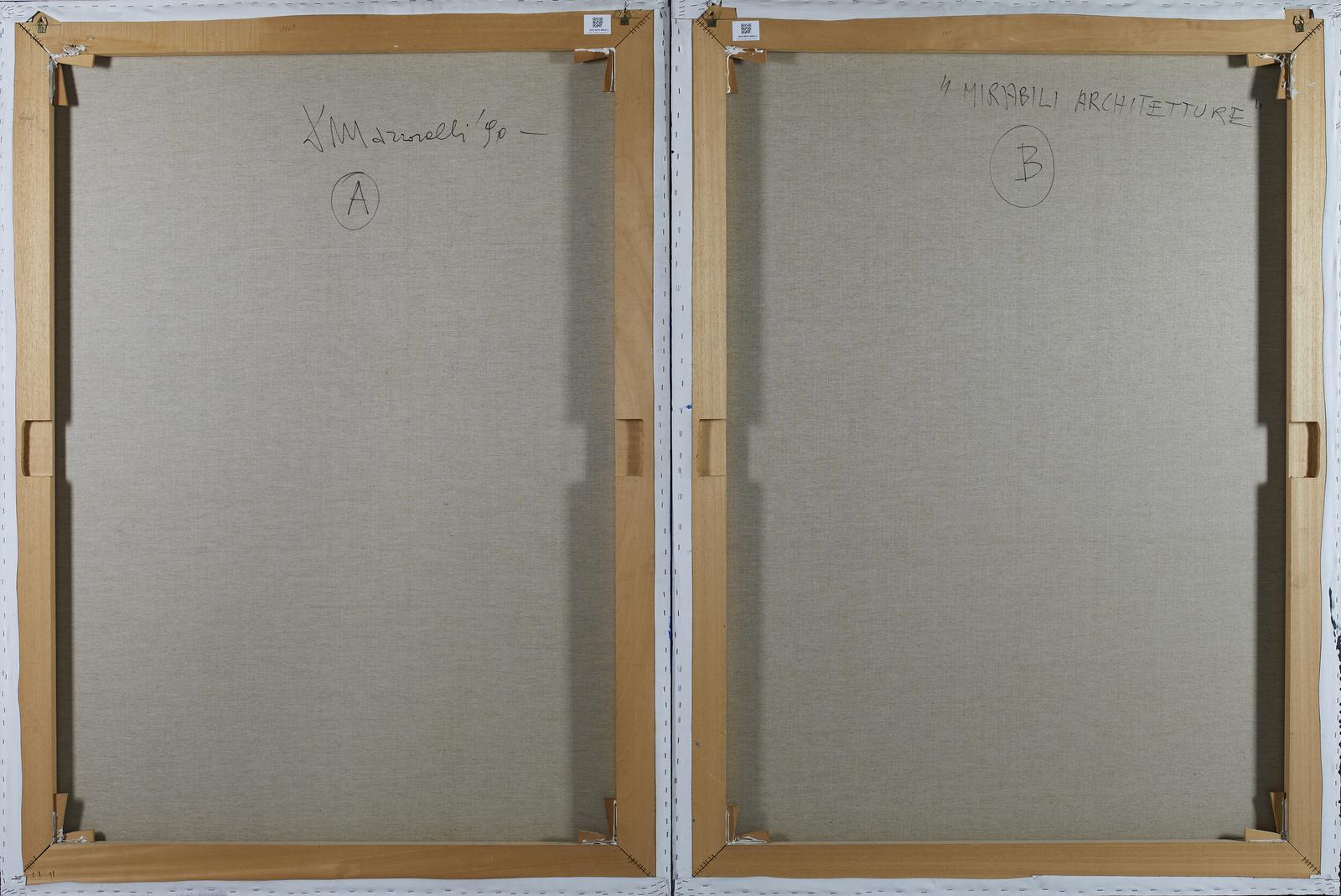 MAZZONELLI DIEGO (n. 1943) Mirabili architetture (dittico). 1990. Acrilico su tela. Cm 270,00 x 180,00. Al retro titolo, firma e anno. Dimensione singolo elemento: 180x135 cm. Provenienza: Collezione privata, Trento. Difetti.