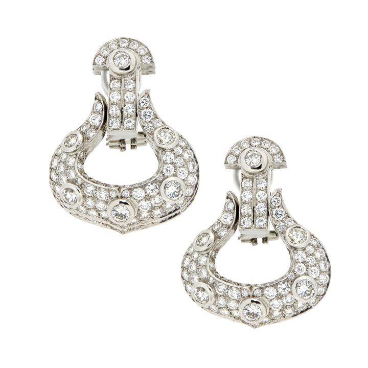 Coppia di orecchini in oro bianco pendenti, di forma fantasia, con diamanti taglio brillante per complessivi ct 9,0 ca