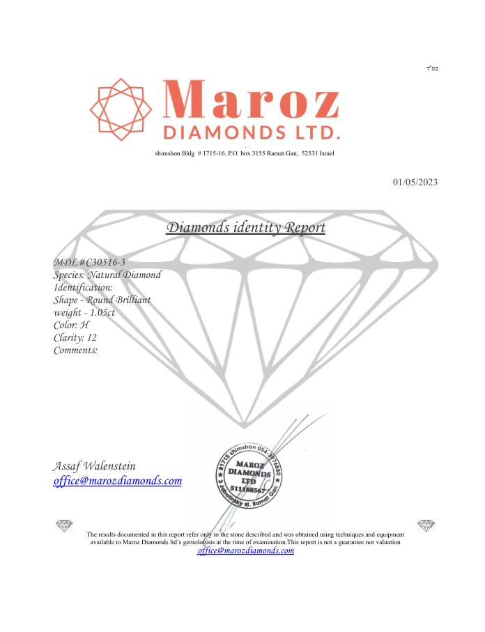 DIAMANTE 1,05 CARATI COLORE H - PUREZZA I2 - TAGLIO BRILLANTE - CERTIFICATO ID - C30516-3
