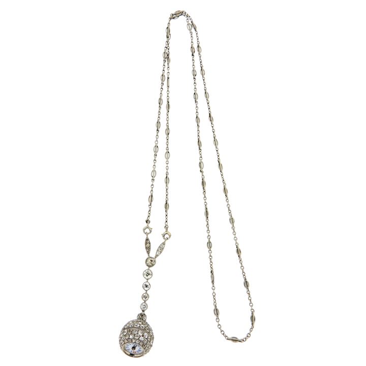 Collana in oro bianco terminante con orologio a mina con diamanti taglio brillante di vecchio taglio per complessivi ct 3,0 ca