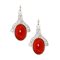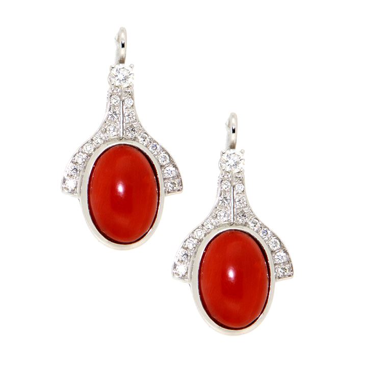 Coppia di orecchini in oro bianco, a monachella, con corpo di forma geometrica in diamanti taglio brillante per complessivi ct 0,50 ca terminanti con due ovali in corallo mediterraneo