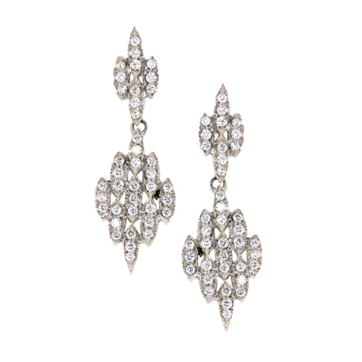 Coppia di orecchini pendenti in oro bianco, a motivo di corteccia, con diamanti taglio brillante per complessivi ct 0,75 ca