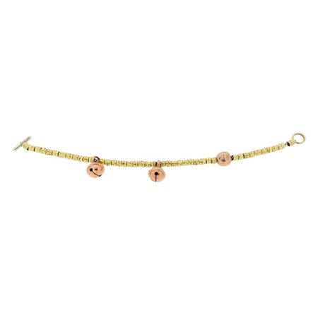 Bracciale, firmato "Pomellato", modello "Dodo", struttura in argento 925 millesimi, con grani in oro giallo e due campanelle in oro rosa linea "Dodo", recanti incisa la frase "Non ti perdere" e una pepita in oro rosa