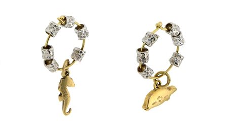 Coppia di orecchini in oro giallo, firmati "Pomellato", modello "Dodo" , con grani in argento 25/1000 e due ciondoli, modello "Dodo", raffiguranti una tartaruga e un cavalluccio marino