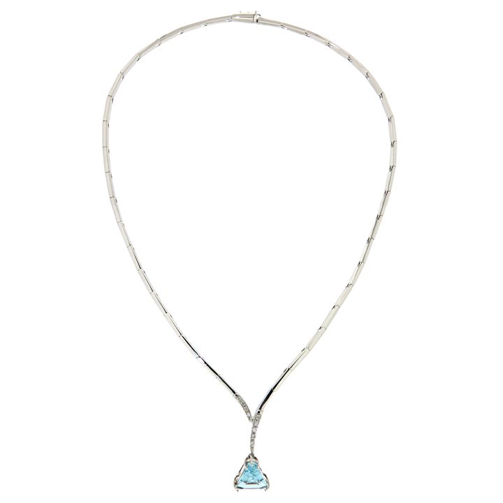 Girocollo in oro bianco, lavorato a segmenti lisci, al centro acquamarina taglio triangolare di ct 3,80 ca e diamanti taglio brillante per complessivi ct 0,10 ca