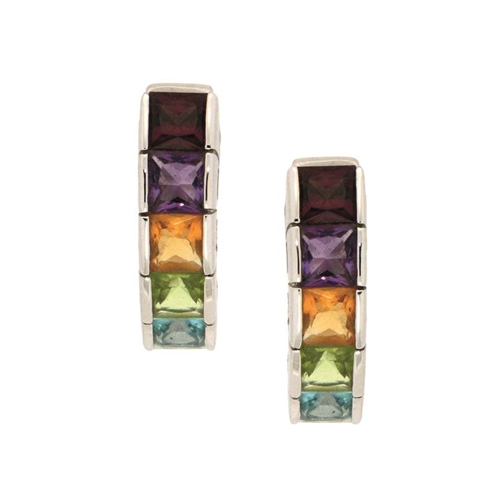Coppia di orecchini in oro bianco, a cerchio, con tormaline di vari colori taglio carrè