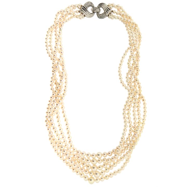 Collana composta da cinque fili di perle giapponesi da mm 3,5 a 7,5; chiusura in oro bianco ad intreccio con diamanti taglio brillante per complessivi ct 0,60 ca