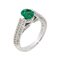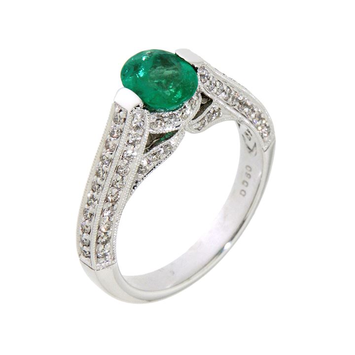 Anello in oro bianco con al centro smeraldo taglio ovale e diamanti taglio brillante per complessivi ct 0,75 ca disposti ai lati e lungo il gambo