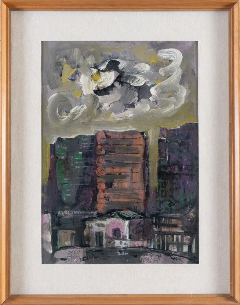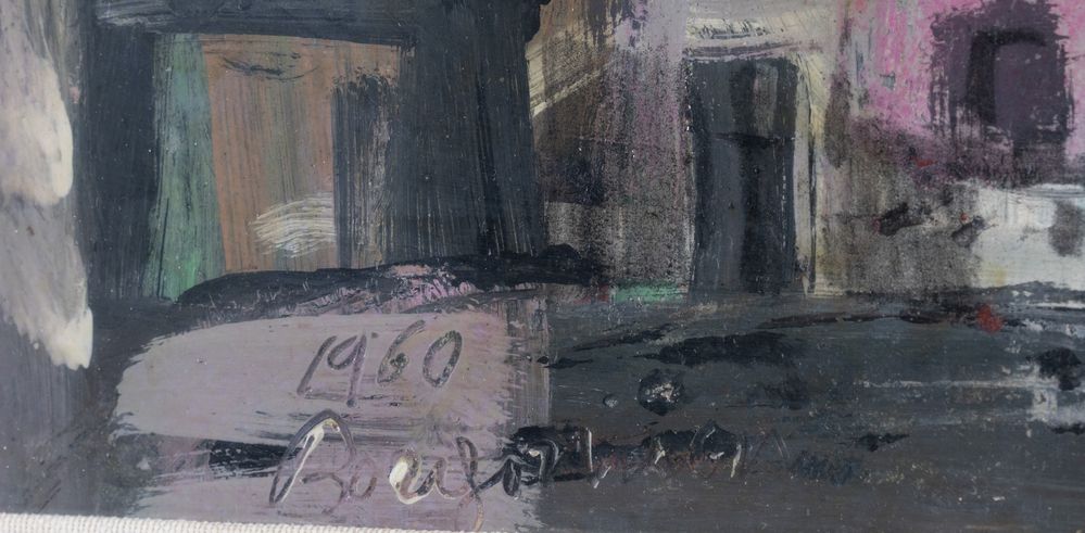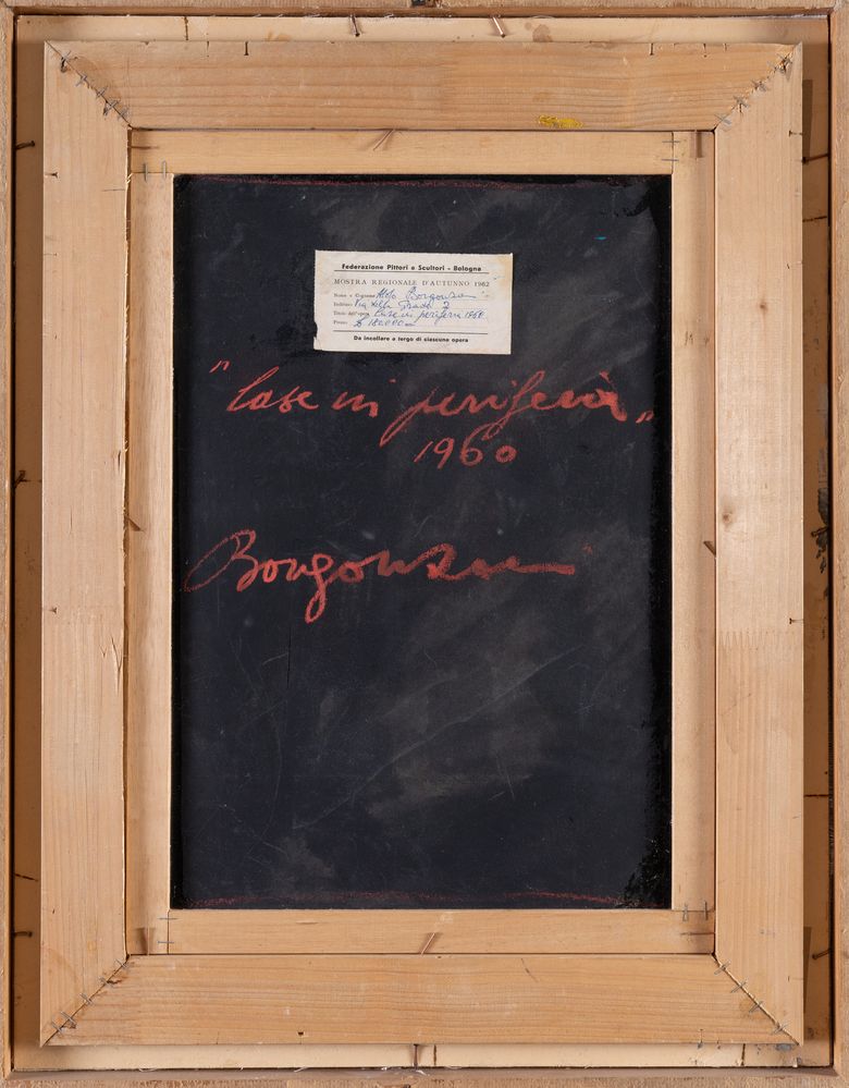 ALDO BORGONZONI (Medicina 1913 - Bologna 2004) "Case in periferia", 1960. Olio su cartone. Cm 46x33. Opera firmata e datata in basso a sinistra 1960 Borgonzoni. Al retro opera intitolata, datata e firmata Case di periferia, 1960, Borgonzoni. Al retro reca etichetta della Mostra Regionale d'Autunno 1962, Federazione Pittori e Scultori, Bologna.