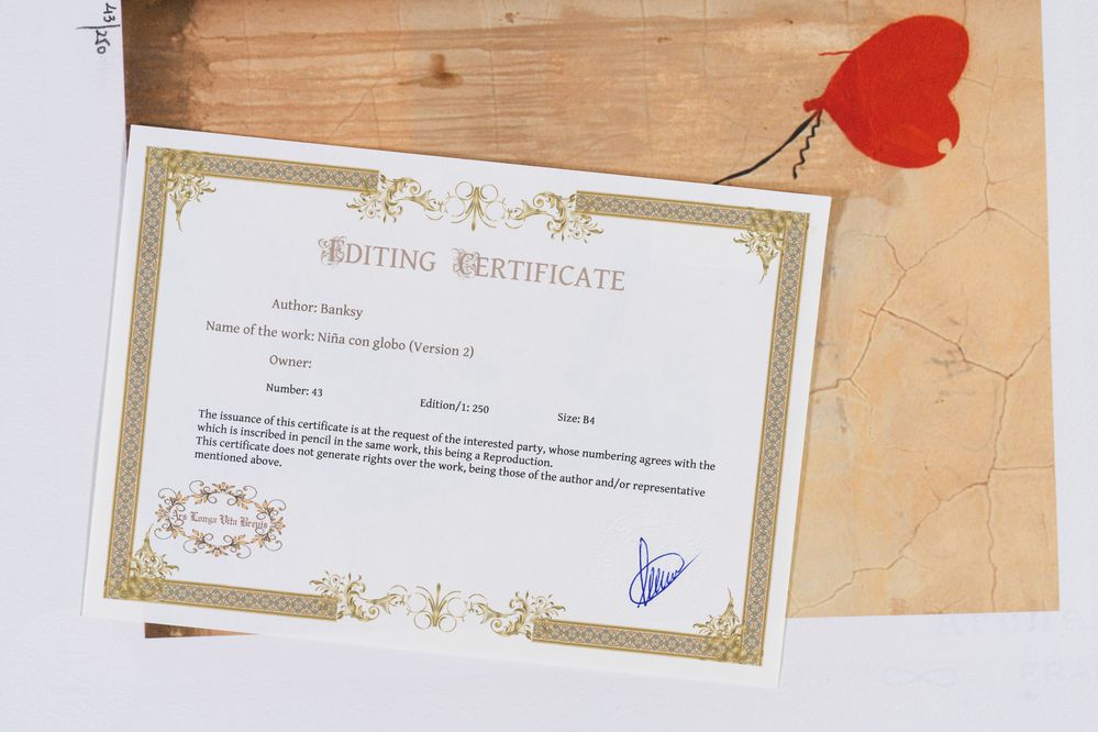 BANKSY (Bristol 1974), after. "Balloon girl". Litografia a colori su carta. Cm 38x28,5. Reca firma stampata in lastra in basso a destra Banksy. Reca numeri di tiratura in basso a sinistra 43/250. Reca in basso a destra timbro a secco di M Arts edition. Al retro reca sticker come certificato di autenticità di M Arts Edition. Opera accompagnata da certificato di autenticità di M Arts Edition.