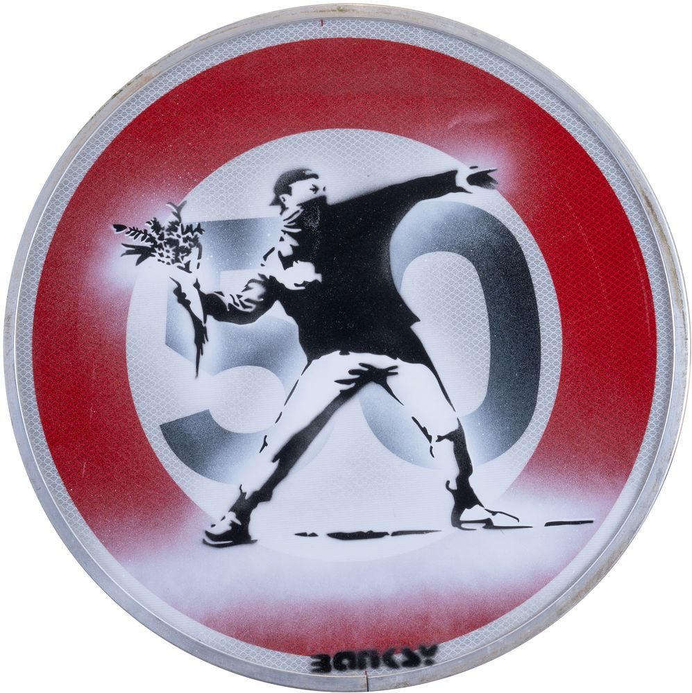 BANKSY (Bristol 1974) "Love is in the air". Spray su segnale stradale. Diametro: cm 47.