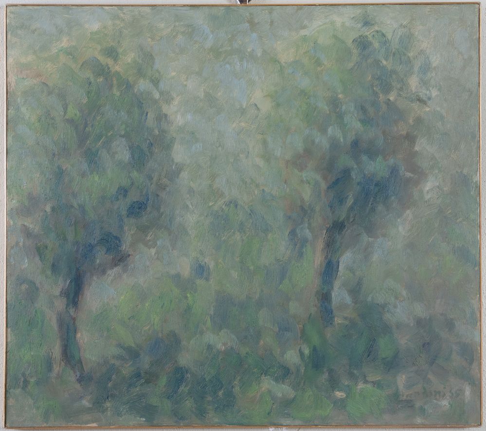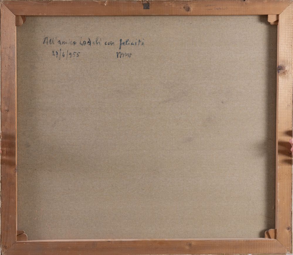 VASCO BENDINI (Bologna 1922 - Roma 2015) "Paesaggio, 1955. Olio su tela. Cm 80x90. Opera firmata e datata in basso a destra Bendini '55. Al retro opera siglata. Al retro reca dedica all'amico Franco Lodoli in data 27 Aprile 1955.