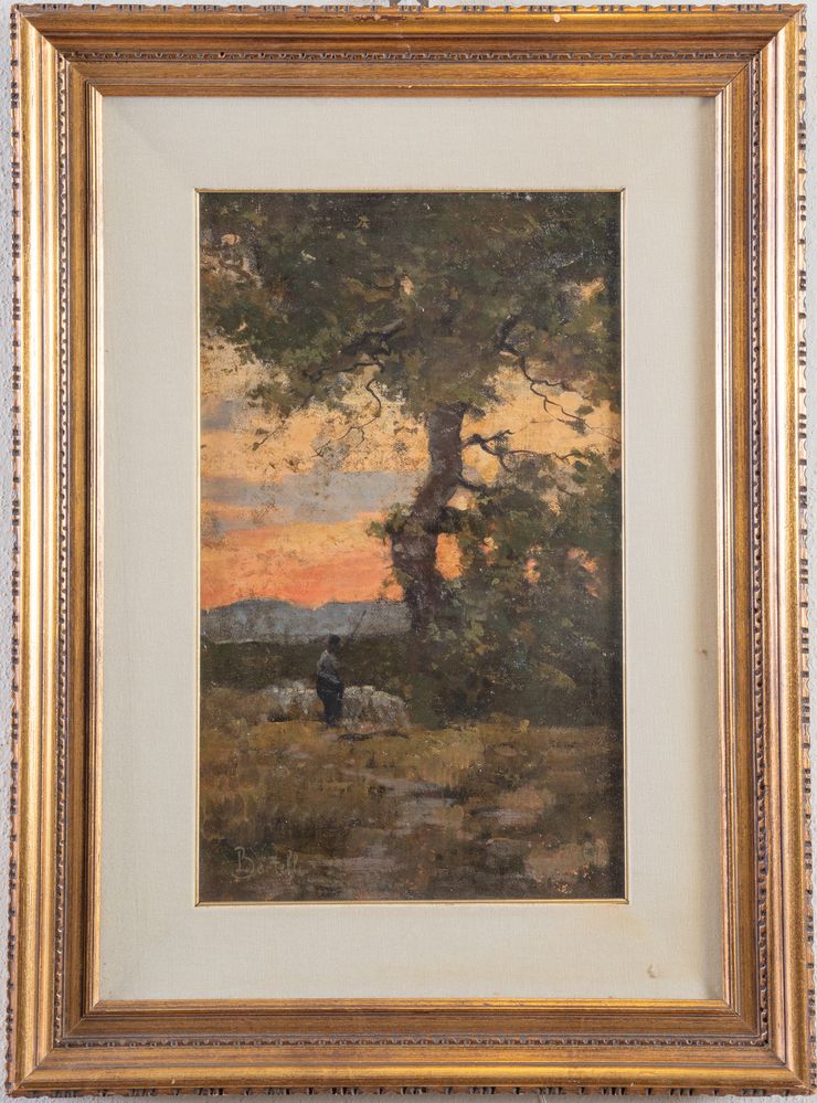 LUIGI BERTELLI (San Lazzaro di Savena 1833 - Bologna 1916) "Gregge al tramonto". Olio su tela applicata su tavola. Cm 45x28. Opera firmata in basso a sinistra L. Bertelli. Al retro reca scritta per autentica a firma Giulio Fiori.