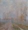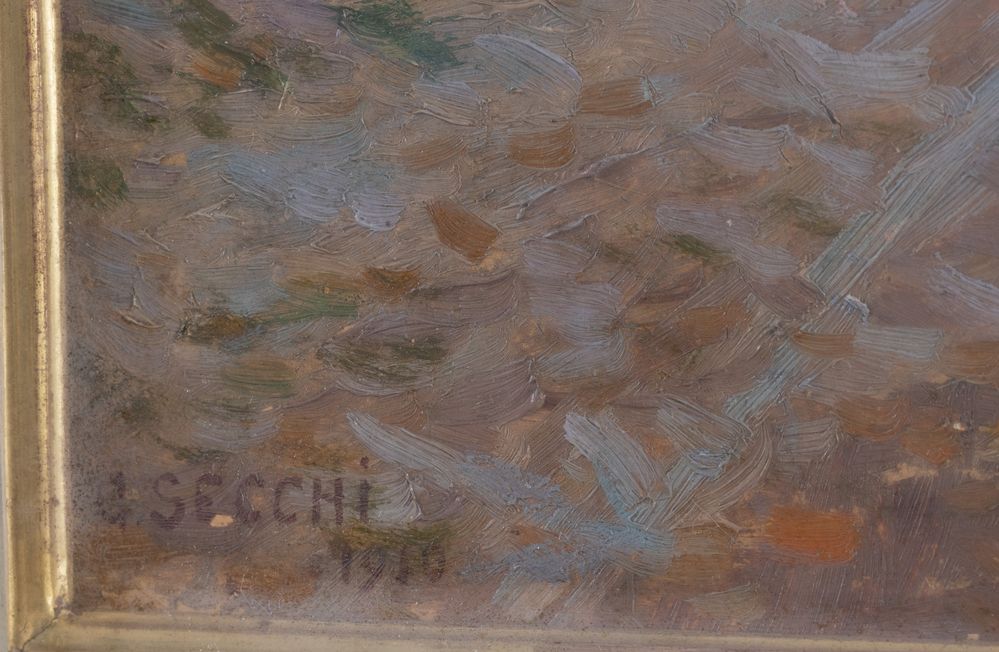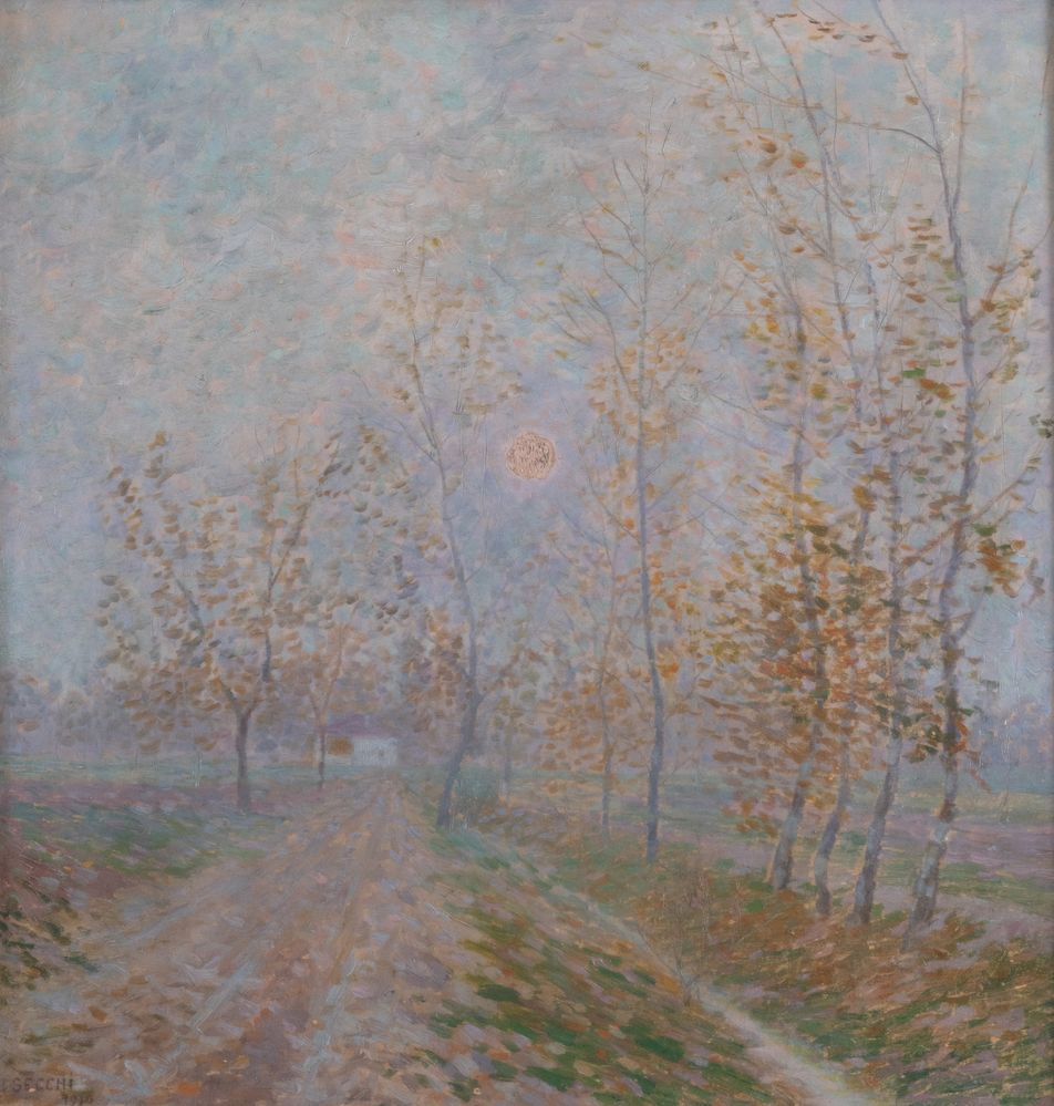 GIOVANNI SECCHI (Bologna 1876 - Darfo Boario Terme 1950) "Alba tra i pioppi", 1910. Olio su cartone. Cm 50,5x49. Opera firmata e datata in basso a sinistra G. Secchi 1910.