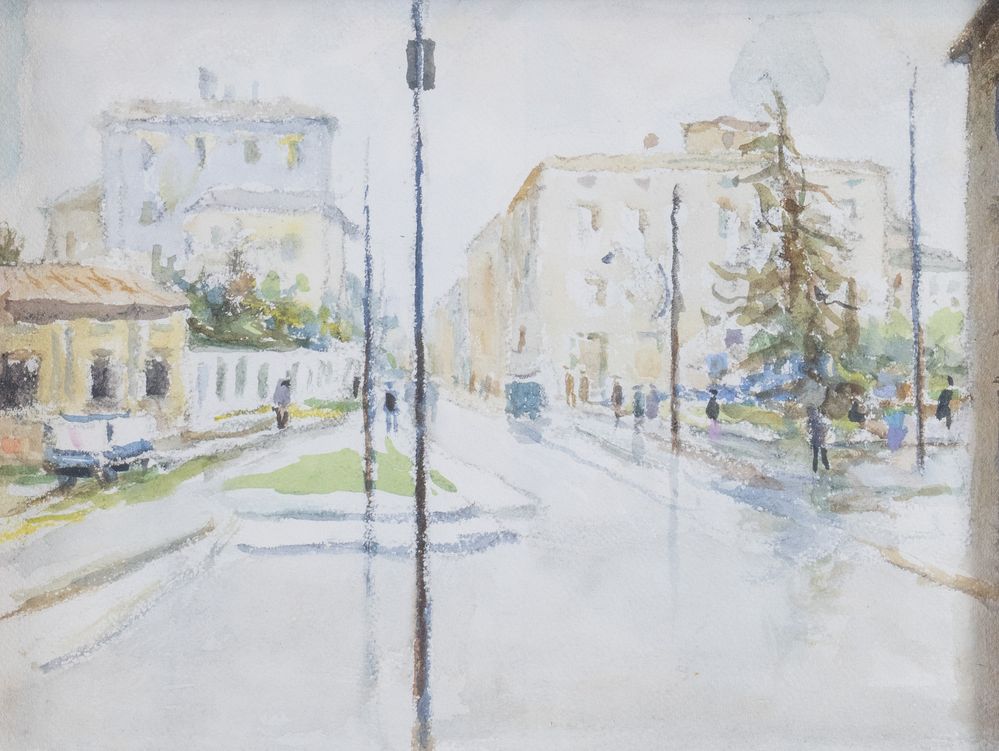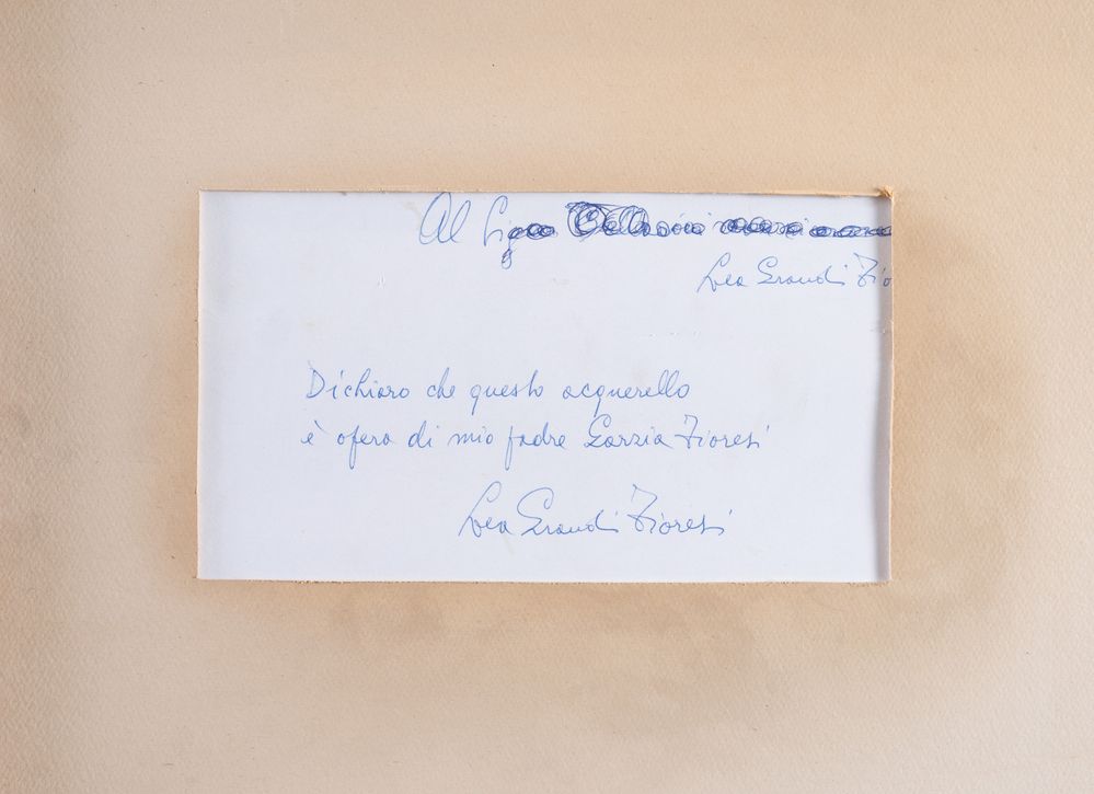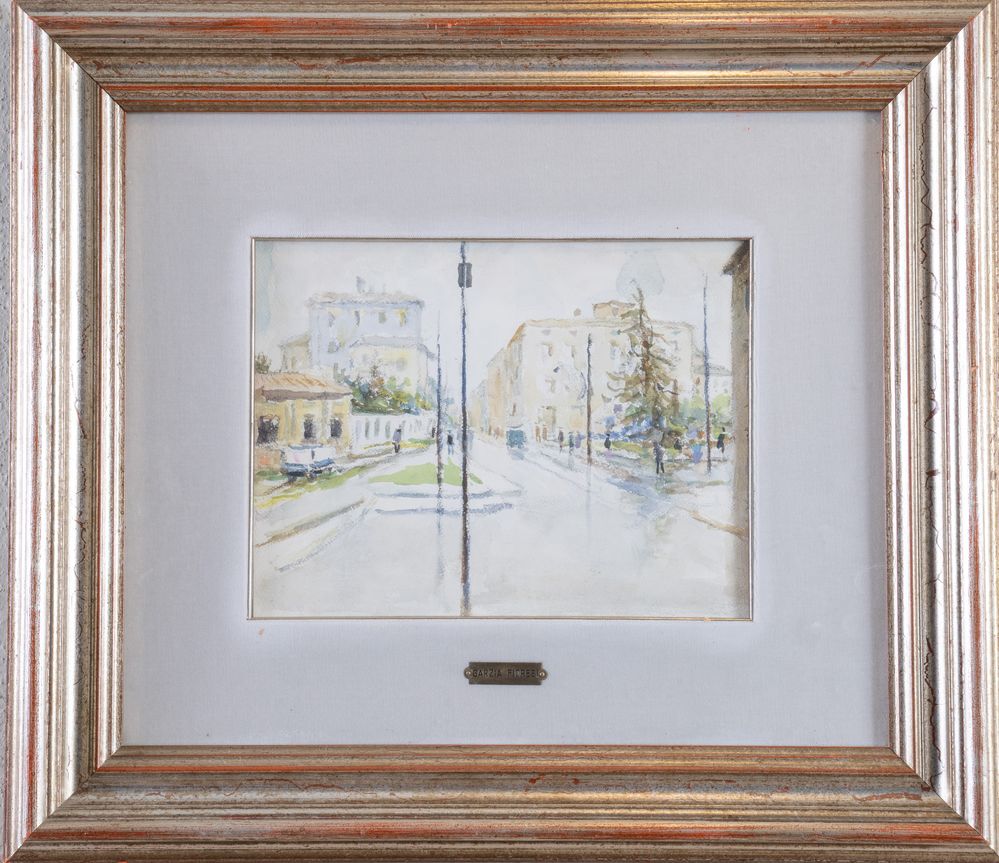 GARZIA FIORESI (Vigevano 1888 – Bologna 1968) "Scorcio cittadino". Acquerello su carta. Cm 21x27,5. Al retro reca iscrizione per autentica a firma della figlia Lea Grandi Fioresi.