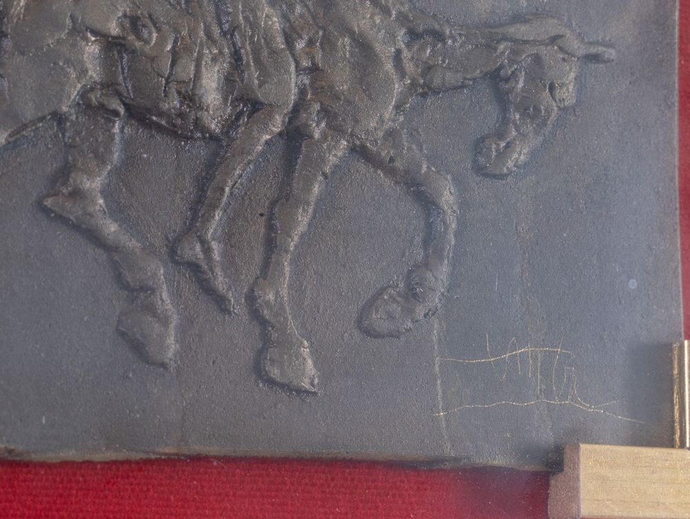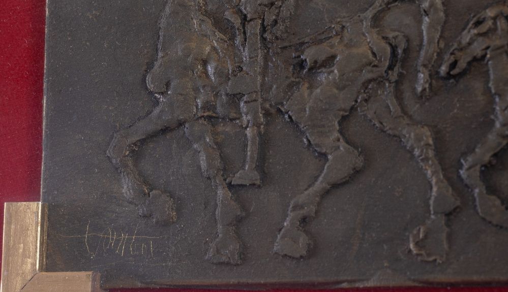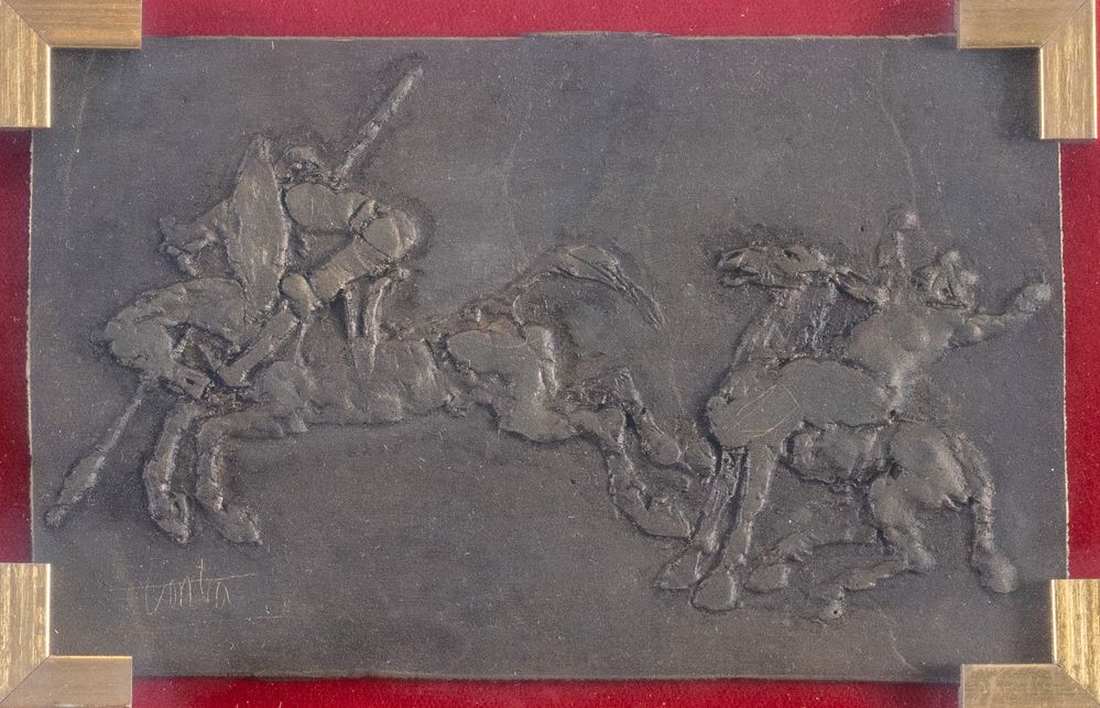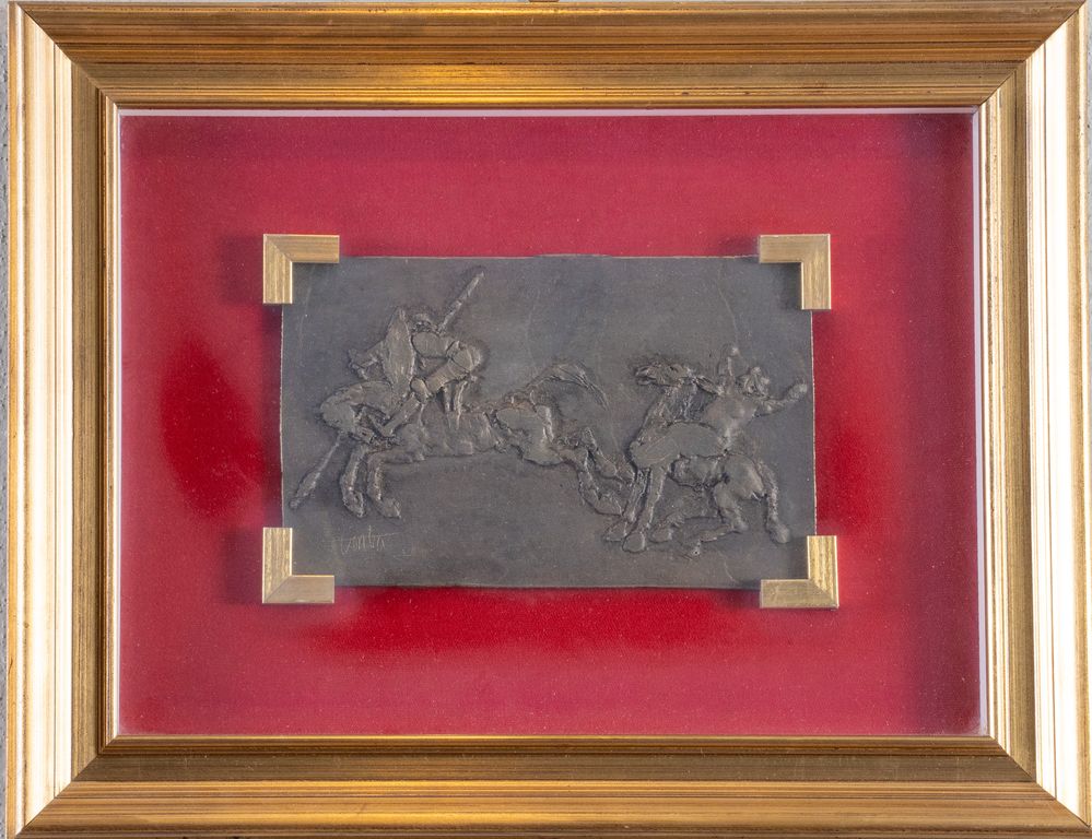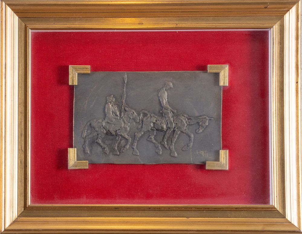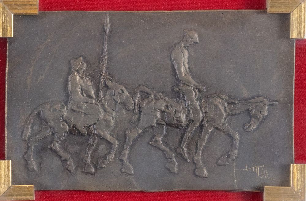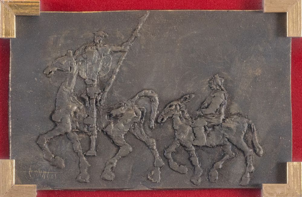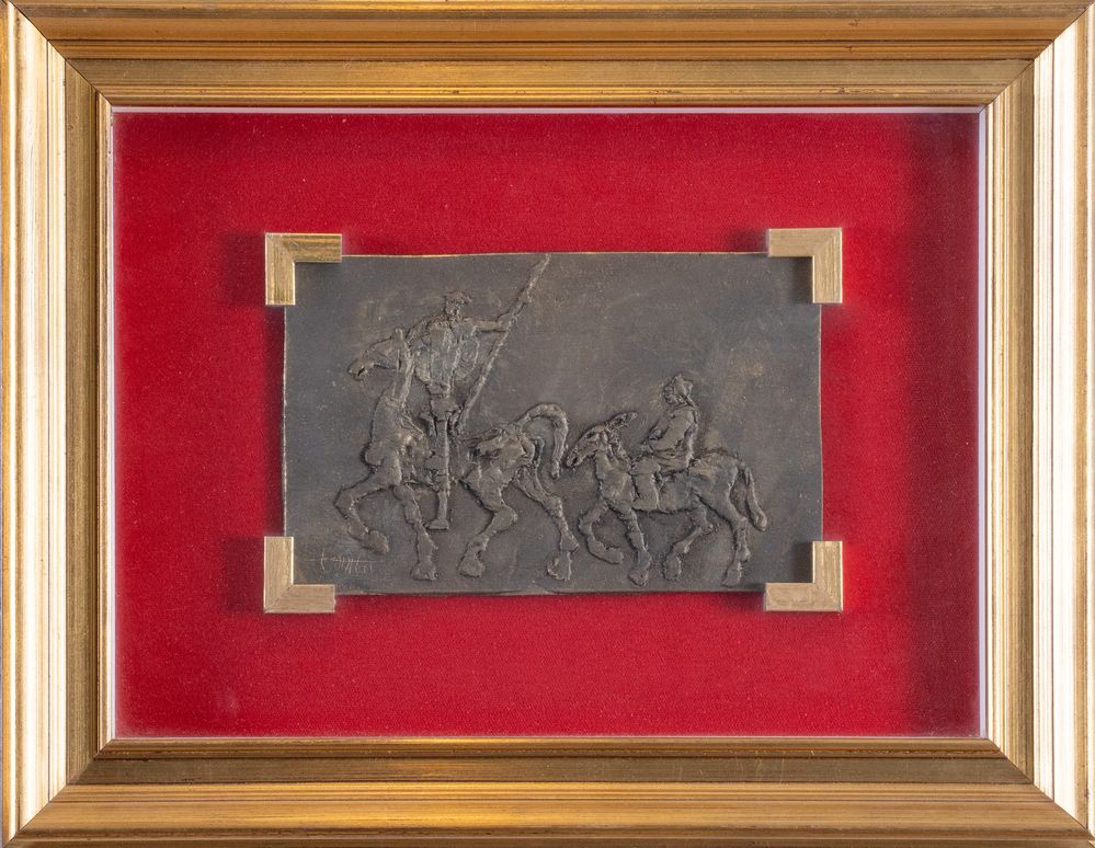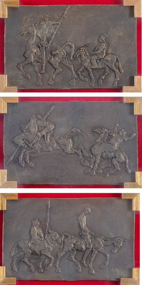 CLETO TOMBA (Castel San Pietro Terme 1898 – Bologna 1987) "Don Chisciotte e Sancho Panza: la partenza, la carica, il ritorno". Lotto composto da tre placche in bronzo. Cadauna di cm 12,5x20. Ogni opera è firmata in basso Tomba.