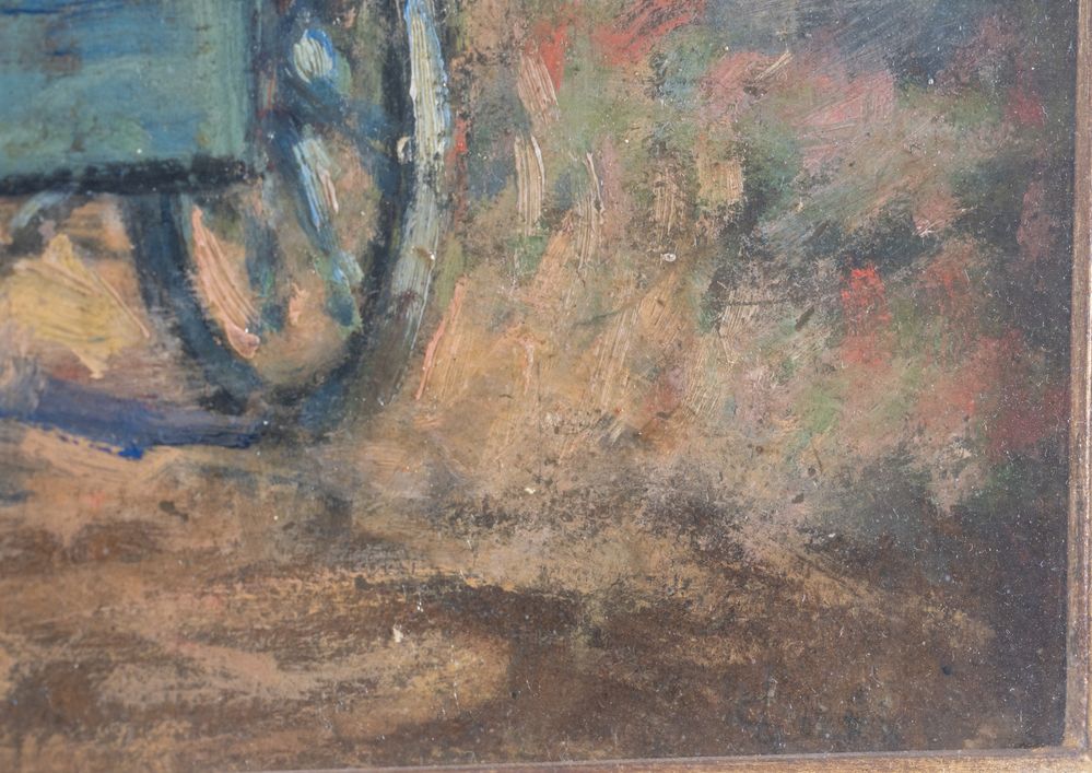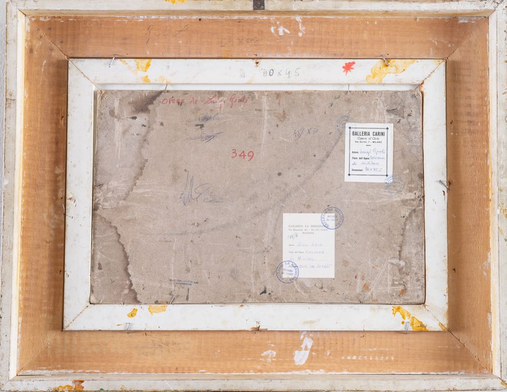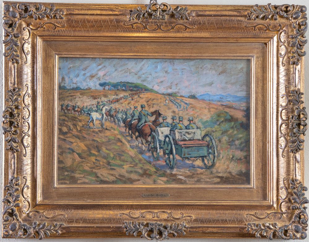 LUIGI GIOLI (San Frediano a Settimo 1855 – Firenze 1947) "Colonna di militari". Olio su cartone. Cm 30x45. Opera firmata in basso a destra Gioli. Al retro reca etichetta e timbro della Galleria Carini, Milano. Al retro reca etichetta e timbro della Galleria La Meridiana, Bologna di Alberto Giordani. Al retro reca timbro della Bottega d'Arte, Montecatini. Al retro reca diverse firme non decifrate. Opera accompagnata da dichiarazione di autenticità in data 1979 della Galleria La Meridiana, Bologna con firma di Alberto Giordani.