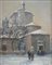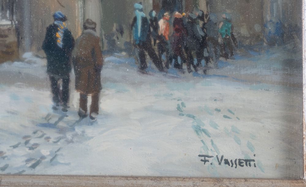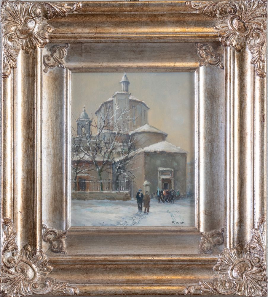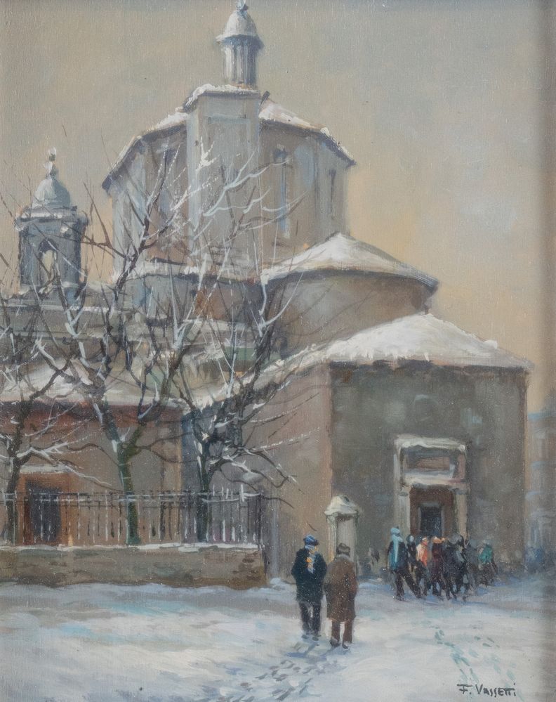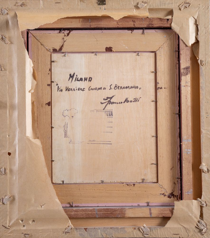 FRANCESCO VASSETTI (Napoli 1936 - 2020) "Via Verziere, Chiesa di San Bernardino". Olio su tavola. Cm 25x20. Opera firmata in basso a destra F. Vassetti. Al retro opera intitolata e firmata Via Verziere, Chiesa di San Bernardino, Franco Vassetti. Al retro reca timbro non identificato.