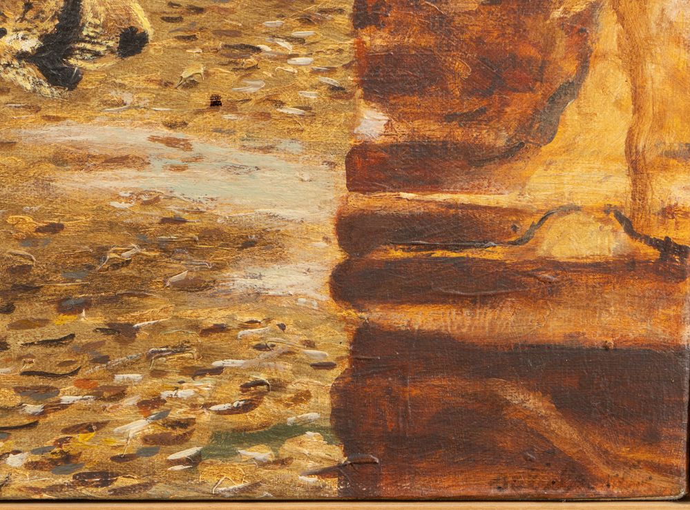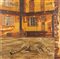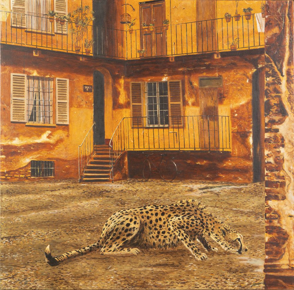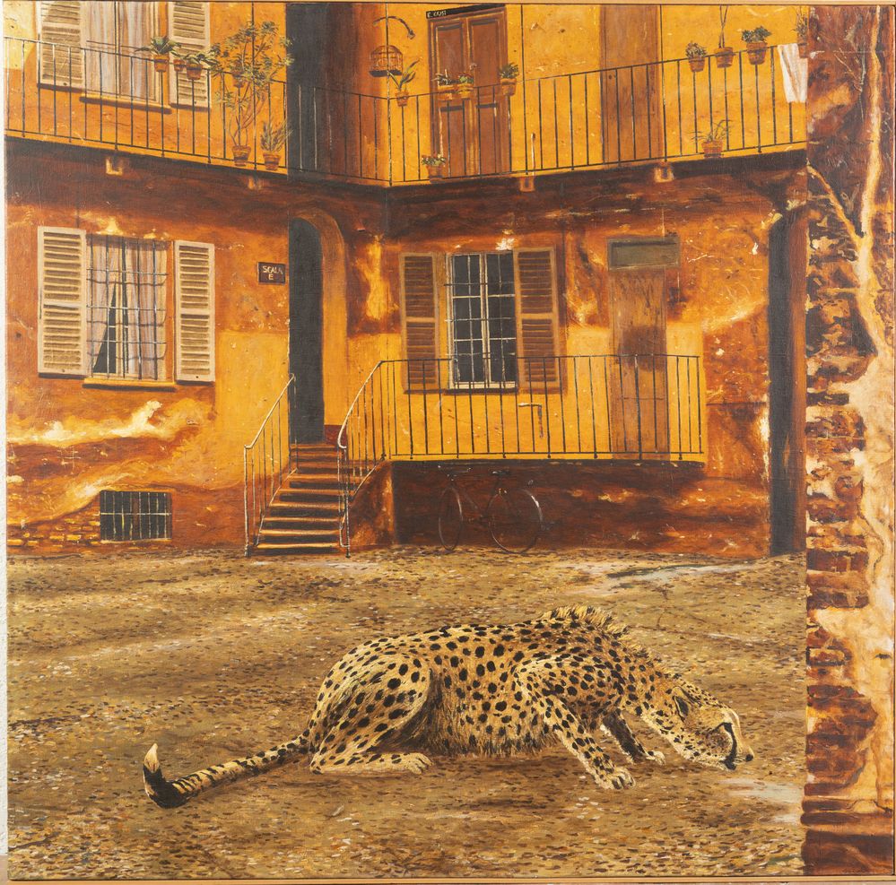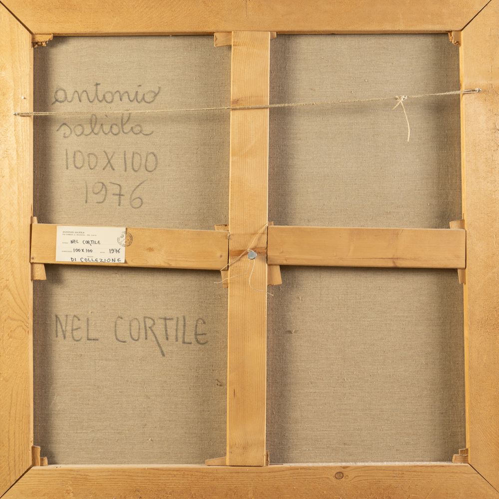 ANTONIO SALIOLA (Bologna 1939) "Nel cortile", 1976. Olio su tela. Cm 100x100. Opera firmata e datata in basso a destra Saliola '76. Al retro opera firmata, datata e intitolata Antonio Saliola, 1976, Nel cortile. Al retro reca etichetta del pittore.