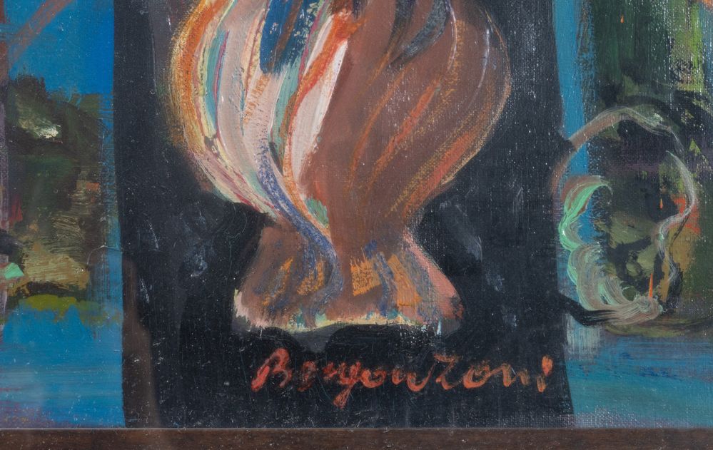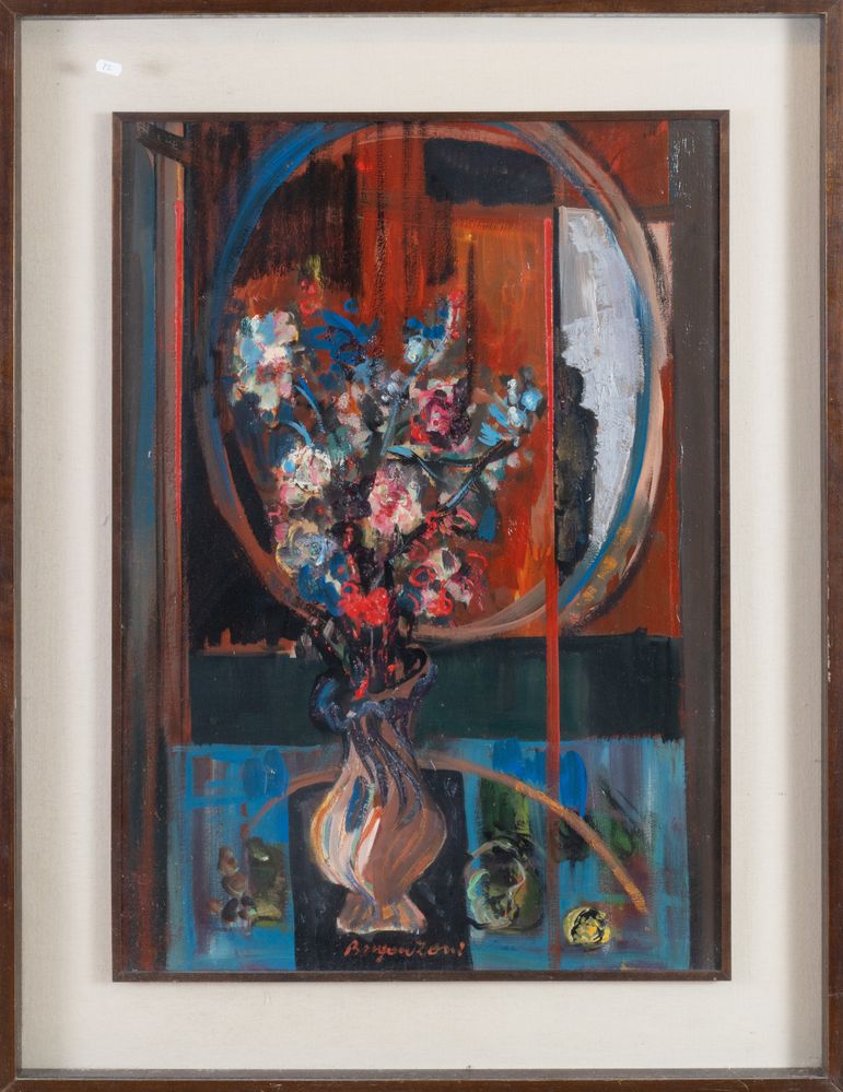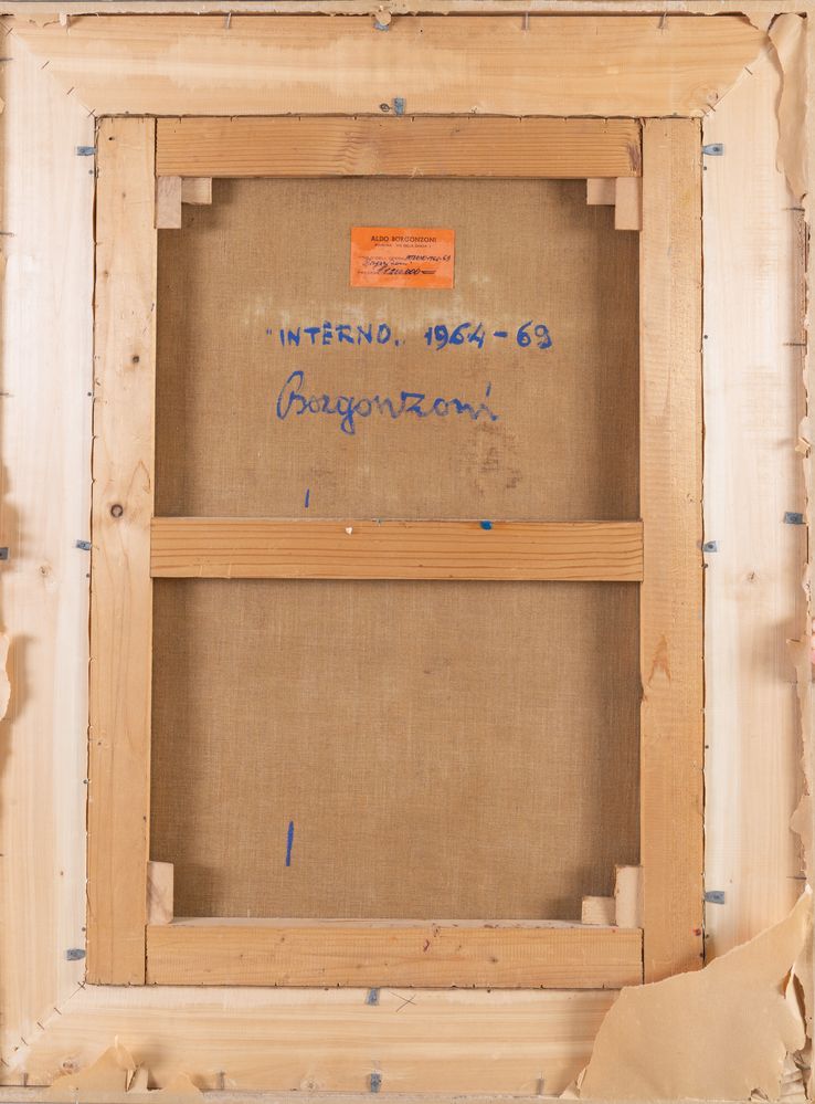 ALDO BORGONZONI (Medicina 1913 - Bologna 2004) "Interno", 1964 - 1969. Olio su tela. Cm 84x59. Opera firmata in basso al centro Borgonzoni. Al retro opera intitolata, datata e firmata Interno, 1964 - 69, Borgonzoni. Al retro reca etichetta dell'artista.