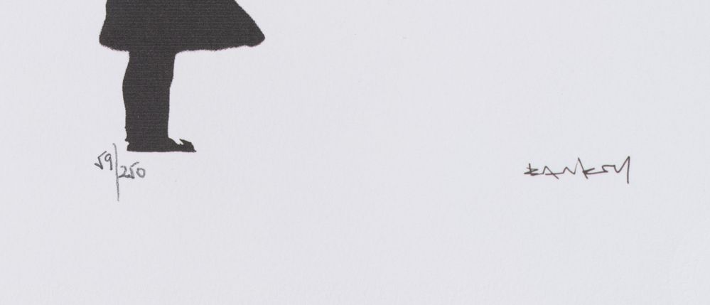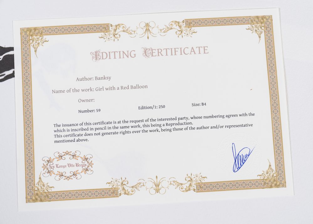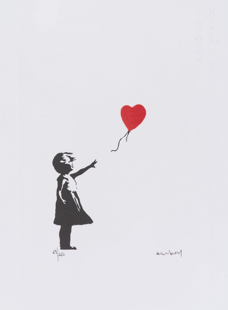 BANKSY (Bristol 1974), after. "Balloon girl". Litografia a colori su carta. Cm 38x28,5. Reca firma stampata in lastra in basso a destra Banksy. Reca numeri di tiratura in basso a sinistra 59/250. Reca in basso a destra timbro a secco di M Arts edition. Al retro reca sticker come certificato di autenticità di M Arts Edition. Opera accompagnata da certificato di autenticità di M Arts Edition.