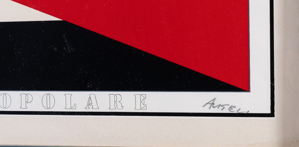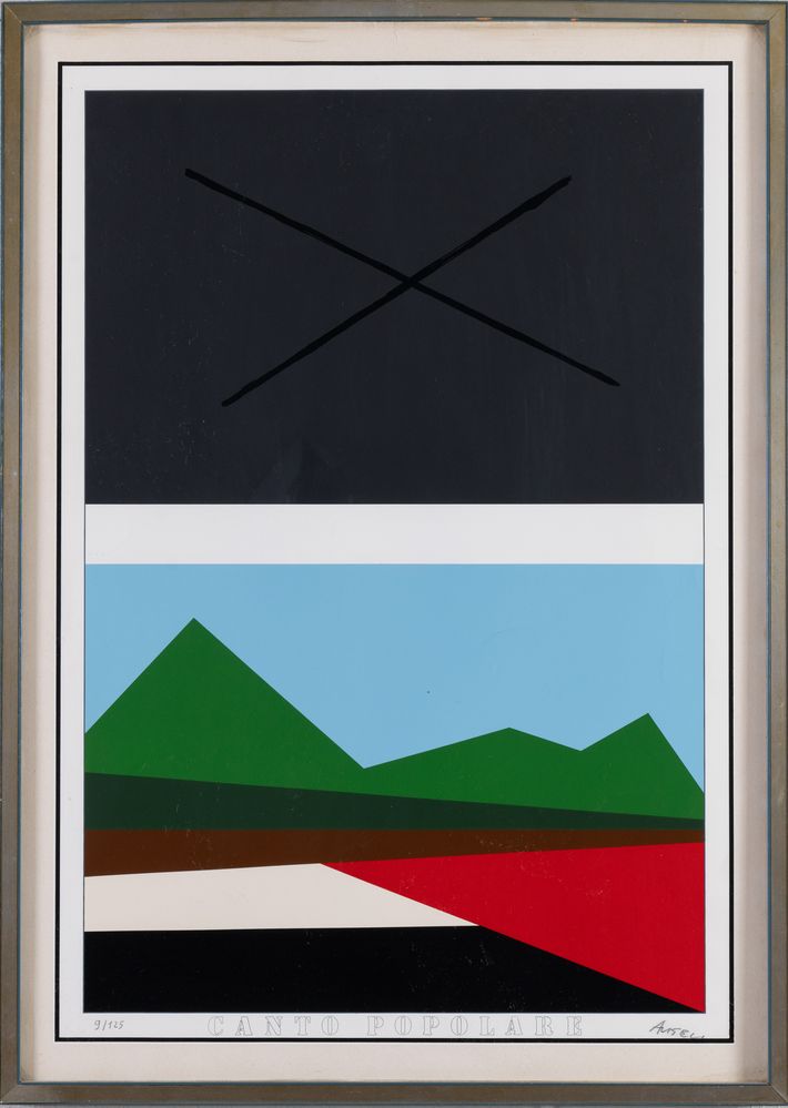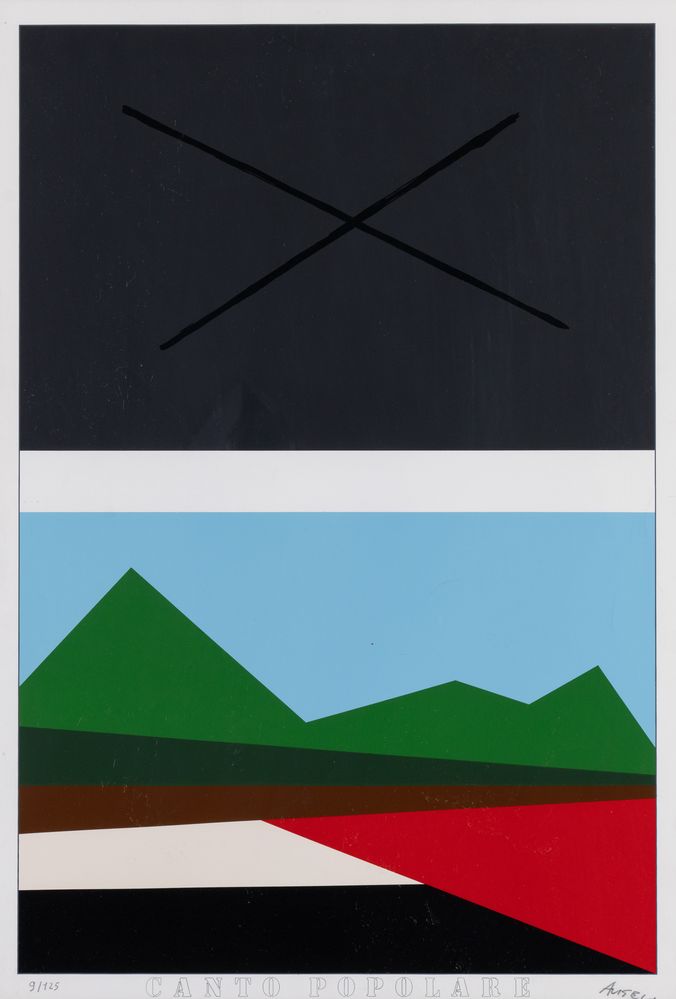 FRANCO ANGELI (Roma 1935 - Roma 1988) "Canto popolare", anni '70. Litografia a colori su carta. Foglio: cm 70x50; lastra: cm 64,5x45,6. Opera firmata in basso a destra Angeli. Reca numeri di tiratura in basso a sinistra 9/125. Opera intitolata al centro Canto popolare.
