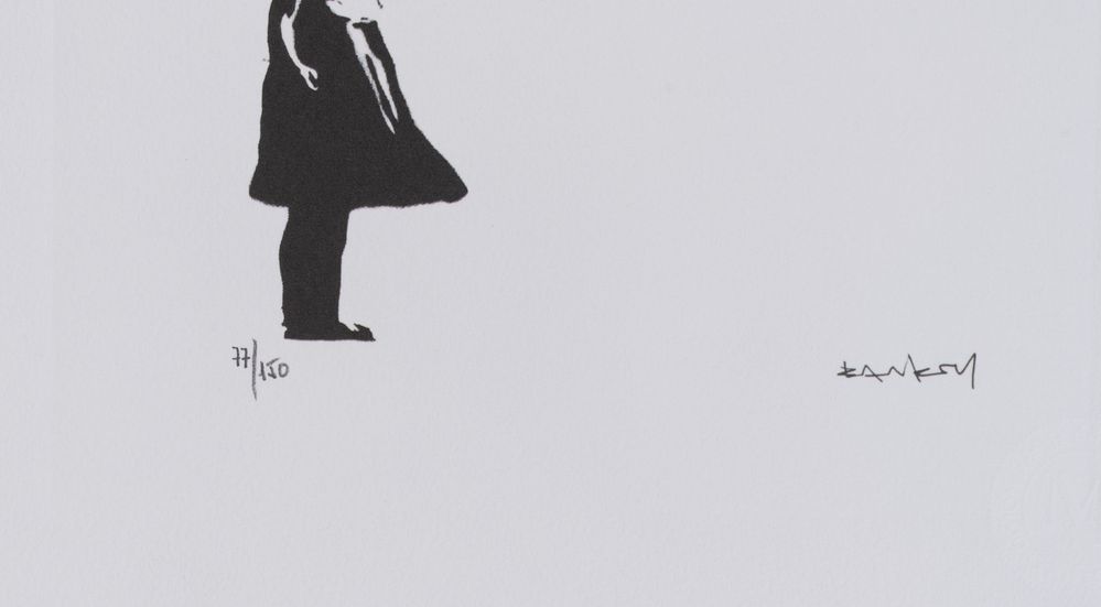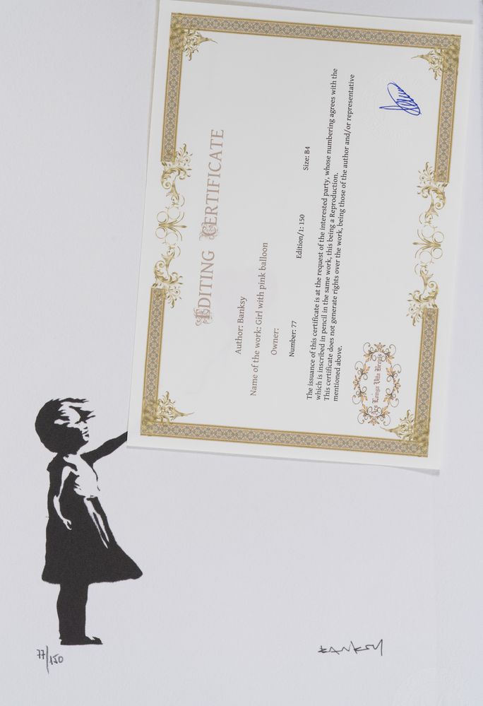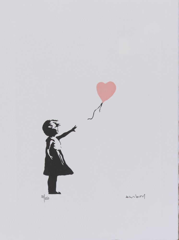 BANKSY (Bristol 1974), after. "Balloon girl". Litografia a colori su carta. Cm 38x28,5. Reca firma stampata in lastra in basso a destra Banksy. Reca numeri di tiratura in basso a sinistra 77/150. Reca in basso a destra timbro a secco di M Arts edition. Al retro reca sticker come certificato di autenticità di M Arts Edition. Opera accompagnata da certificato di autenticità di M Arts Edition.