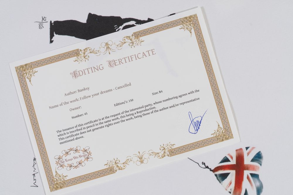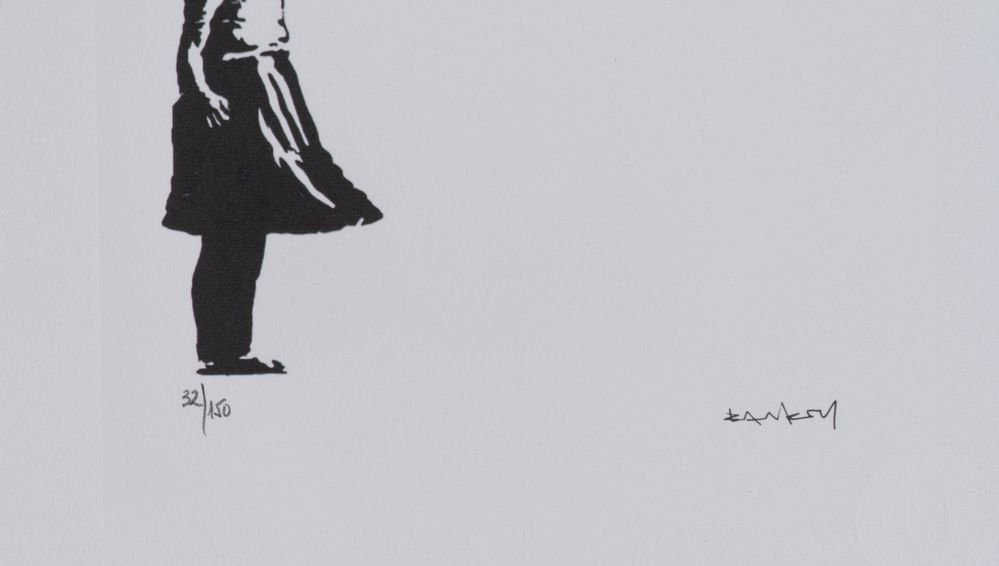 BANKSY (Bristol 1974), after. "Balloon girl". Litografia a colori su carta. Cm 38x28,5. Reca firma stampata in lastra in basso a destra Banksy. Reca numeri di tiratura in basso a sinistra 32/150. Reca in basso a destra timbro a secco di M Arts edition. Al retro reca sticker come certificato di autenticità di M Arts Edition. Opera accompagnata da certificato di autenticità di M Arts Edition.