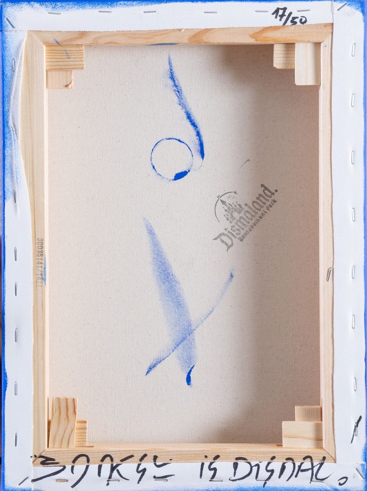 BANKSY (Bristol 1974) "Dismaland", 2015. Spray su tela. Cm 40x30. Opera firmata a lato Banksy. Al retro reca timbro Dismaland. Al retro reca numeri di tiratura 17/50. Opera accompagnata da ticket d'ingresso a Dismaland.